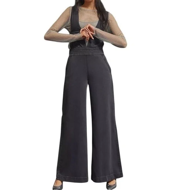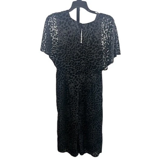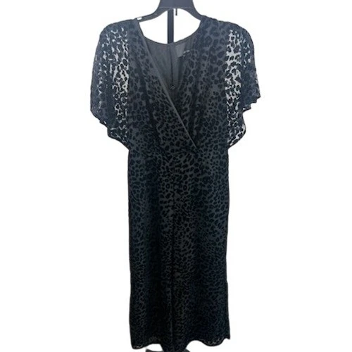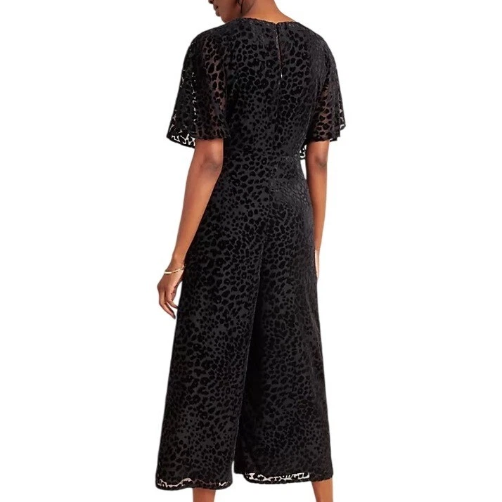 Elegant black jumpsuit featuring a luxurious velvet leopard print. This sophisticated one-piece boasts a flattering V-neck, delicate flutter sleeves with a lace-like texture, and a comfortable, wide-leg silhouette that hits below the knee (cropped). The design includes a concealed back zipper for easy wear, and is fully lined. Perfect for a cocktail party, a special event, or a stylish night out.