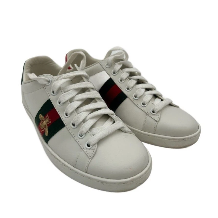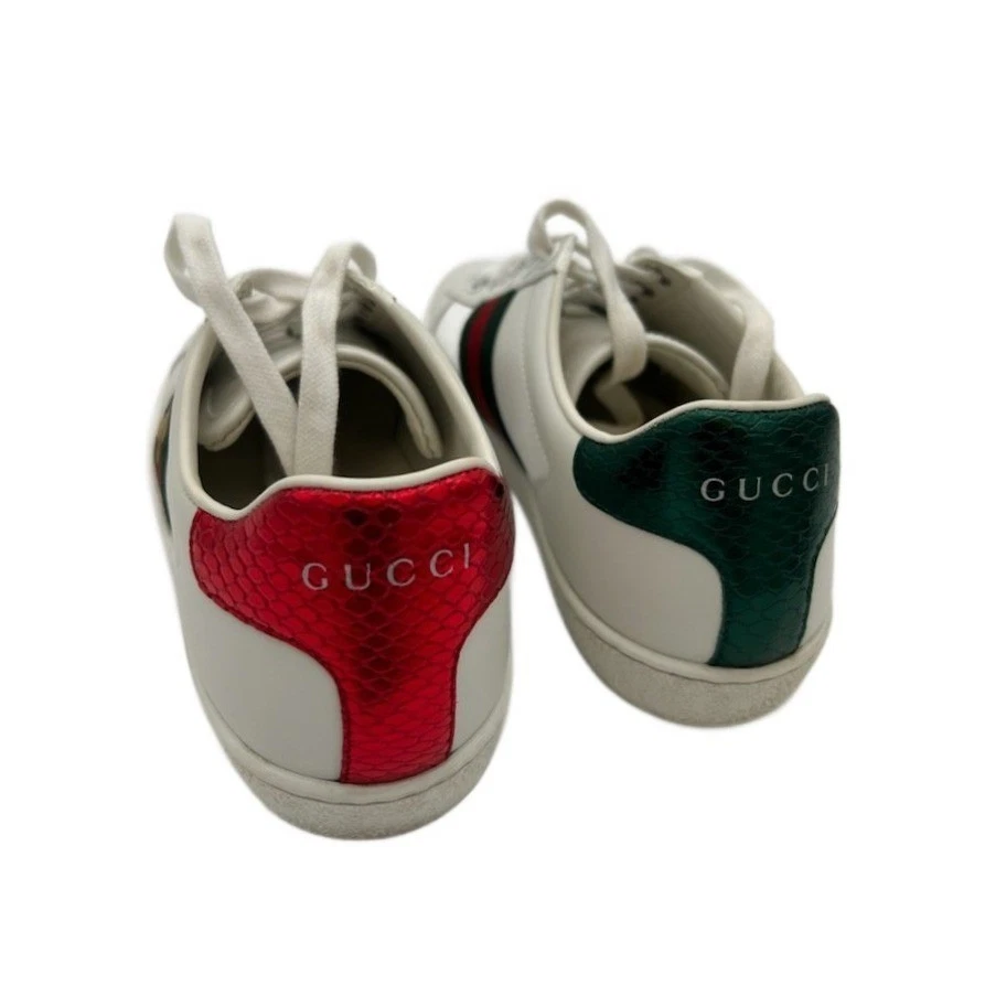 Excellent condition, authentic and awesome! Gucci white leather Ace sneakers adorned with signature green and red stripe detail featuring an embroidered gold bee. These iconic low-top sneakers showcase a distinctive red snakeskin-embossed heel on one shoe and a green snakeskin-embossed heel on the other, both with the embossed Gucci logo. The interior features a Made in Italy stamp and model number. Perfect for elevating casual ensembles or adding a touch of luxury to weekend wear.