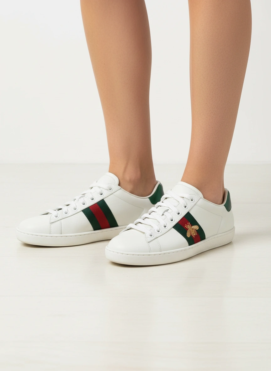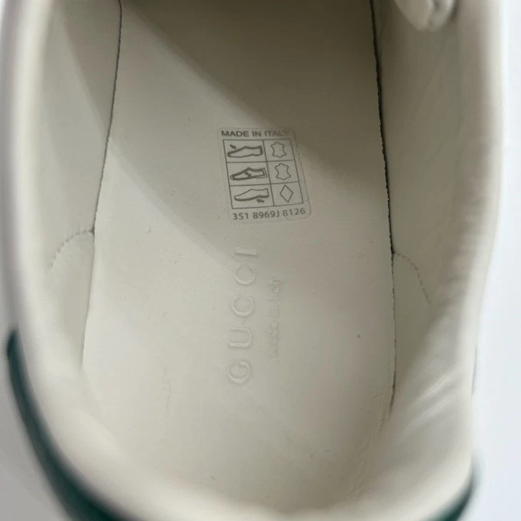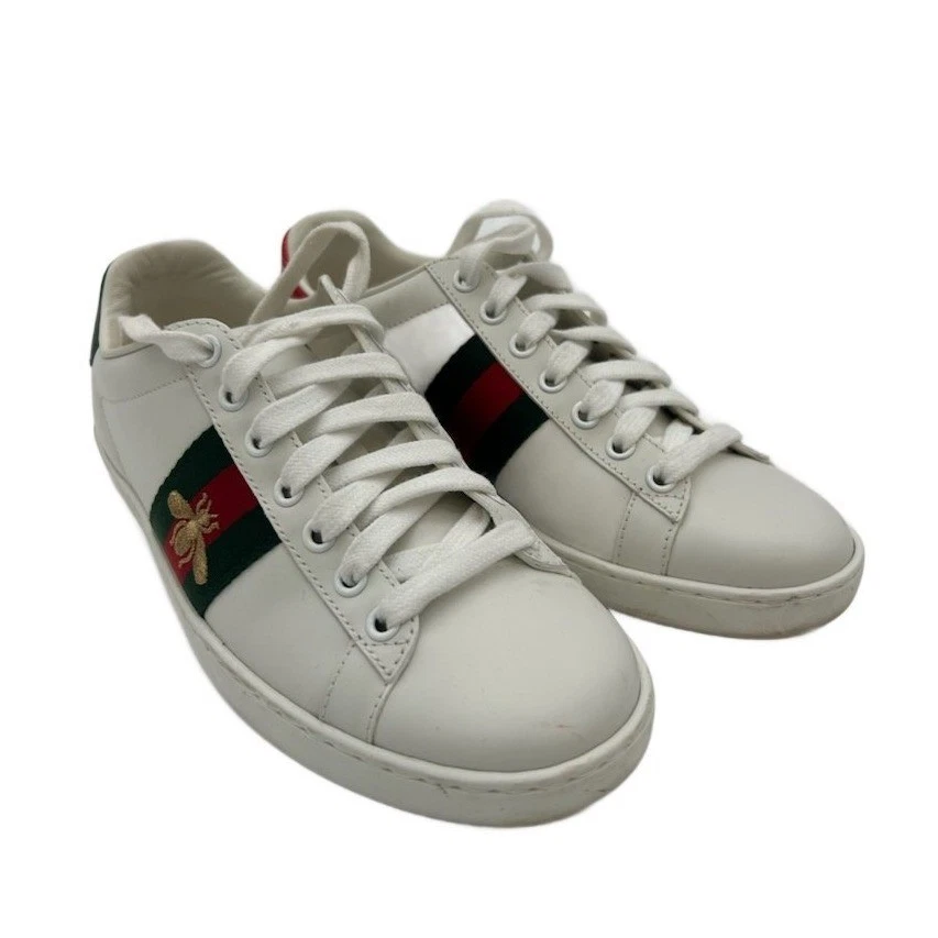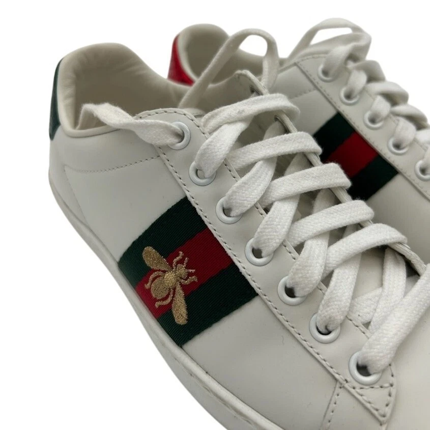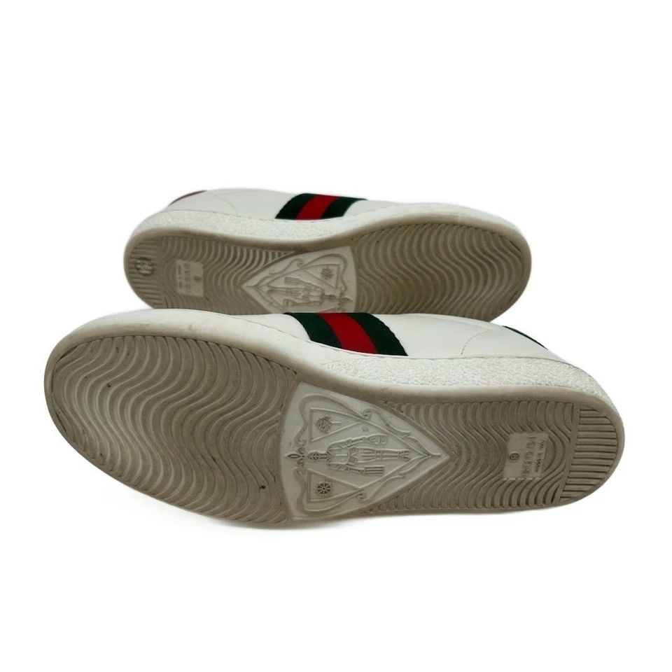 Like new condition, authentic and awesome! Gucci white leather Ace sneakers adorned with signature green and red stripe detail featuring an embroidered gold bee. These iconic low-top sneakers showcase a distinctive red snakeskin-embossed heel on one shoe and a green snakeskin-embossed heel on the other, both with the embossed Gucci logo. The interior features a Made in Italy stamp and model number. Perfect for elevating casual ensembles or adding a touch of luxury to weekend wear.
