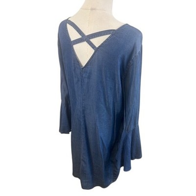 Keywords: denim dress, blue dress, bell sleeve dress, criss cross back, casual dress, women's dress, halston dress, long sleeve dress, bohemian dress, contemporary dress, modern dress, day dress, weekend dress