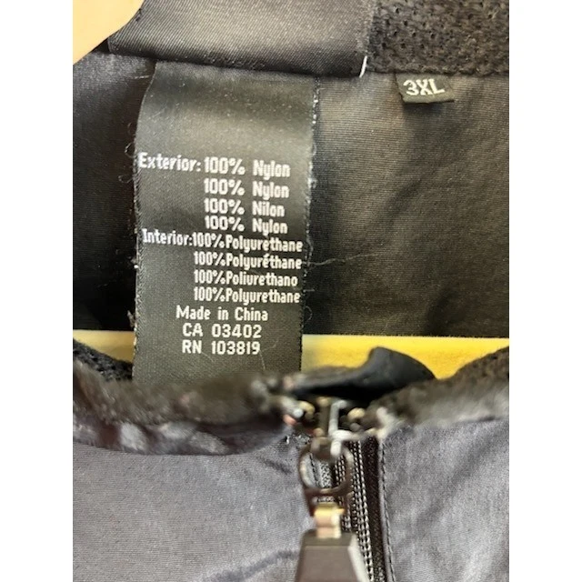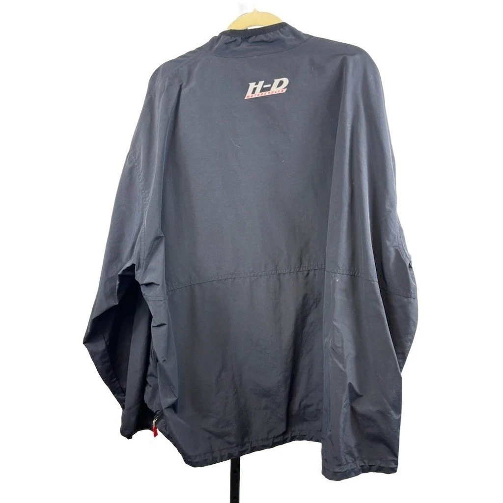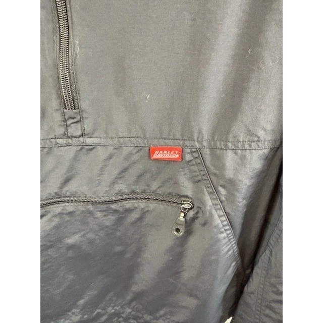 Harley Davidson men’s black windbreaker anorak jacket. This measures 32 inches in length with a 27 inch sleeve length. Features a half-zip closure, a large front kangaroo pocket with a zippered secondary pocket, and the iconic Harley-Davidson logo on the back. Perfect for a motorcycle ride, a casual day out, or travel.