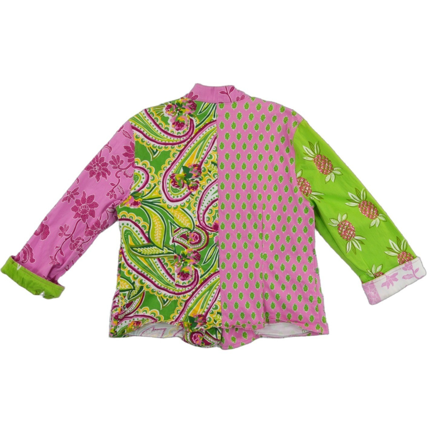 Excellent condition! Vibrant button-up jacket showcases a playful patchwork of paisley, pineapple, and floral motifs in bold pink and lime green hues. Crafted from a comfortable cotton-lycra blend with a hint of stretch, this lightweight layer features a mandarin collar, button-front closure, and functional front patch pockets. The eclectic mix of patterns and contrasting cuffed sleeves makes it a standout statement piece for any creative wardrobe.