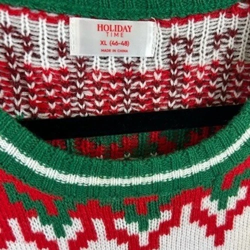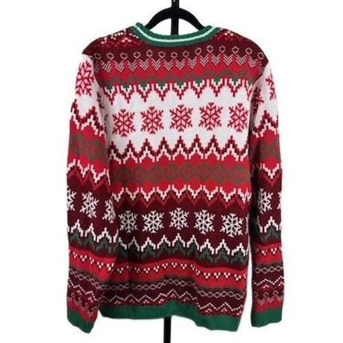 This sweater measures 30″ in length, 37″ in sleeve length, and 23″ pit-to-pit when laid flat. A festive and fun ugly Christmas sweater featuring a playful cat peeking out of a gift box. The sweater showcases a traditional Fair Isle pattern in red, green, and white, with snowflake accents and a prominent, whimsical applique of a cat wrapped in a golden ribbon. This cozy knit is perfect for holiday parties, casual gatherings, or even as a gag gift.