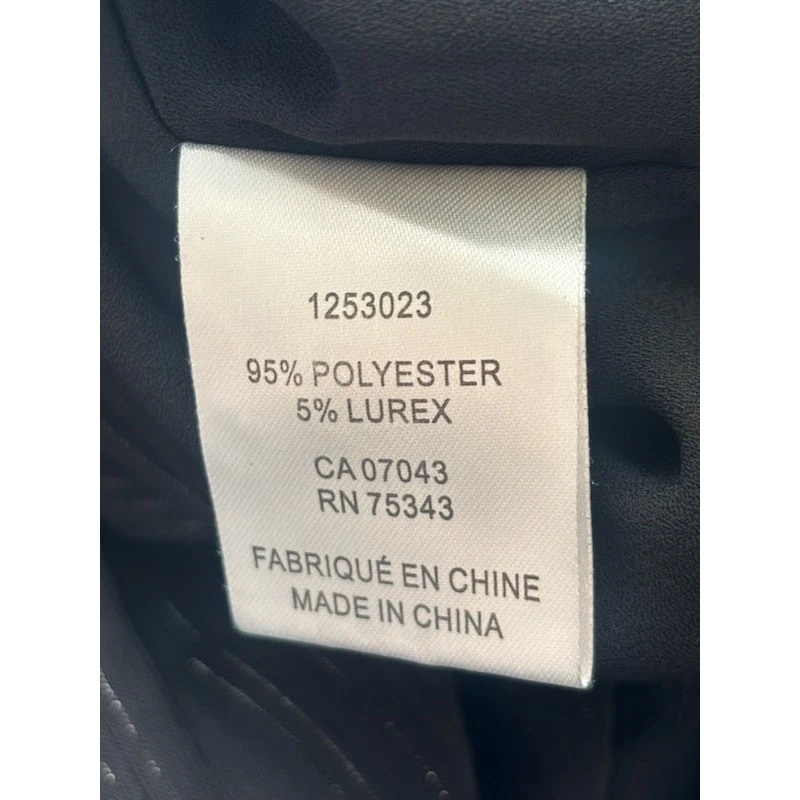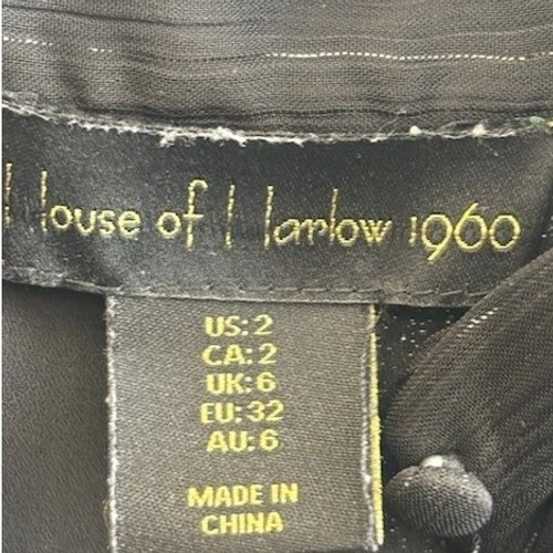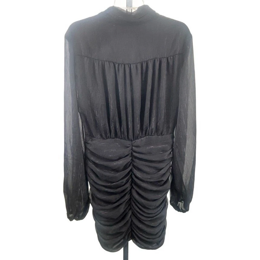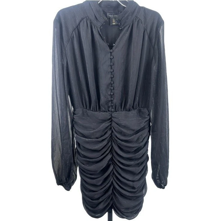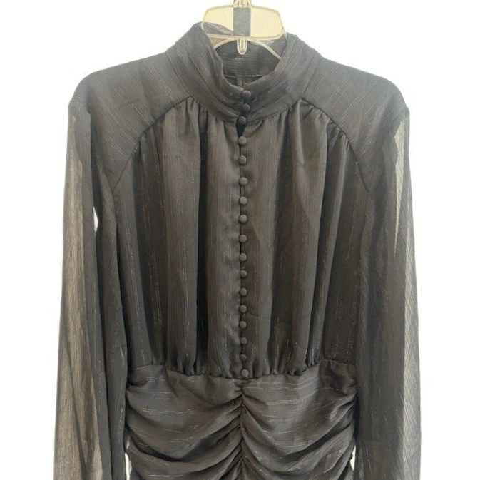 This House of Harlow measures 33 inches in length with a 24 inch sleeve length. It has silver threads. A striking black mini dress crafted from a sheer fabric with subtle metallic threading. This dress features a high neckline and a full button-front closure, complemented by elegant bishop sleeves. The bodice is gathered with intricate ruching across the waist and skirt, creating a flattering silhouette. Perfect for evening cocktails, a sophisticated dinner date, or a glamorous night out.