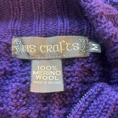 Keywords: NS Crafts, Cardigan, Merino Wool, Cable Knit, Purple, Ireland, Zip Up, Sweater, Medium, Cozy, Aran, Knitwear, Wool Cardigan