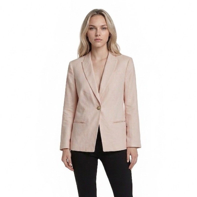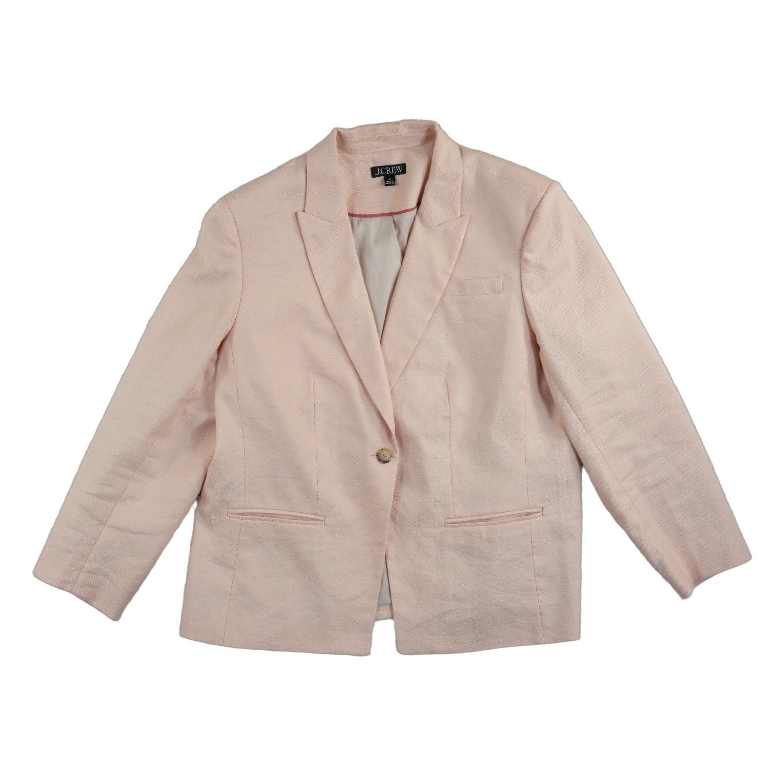 Excellent Condition! J.Crew blazer in a soft light pink hue, crafted from a breathable linen-polyester blend. This structured piece features a classic notched lapel, a single-button front closure, and functional welt pockets. The interior is fully lined for a smooth fit, while the back includes a single vent for ease of movement. Gold-tone hardware accents the cuffs, adding a touch of sophistication to this versatile professional or casual layer.