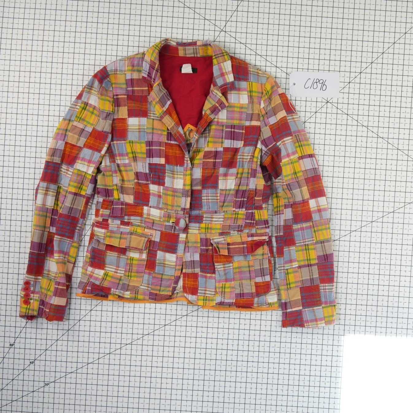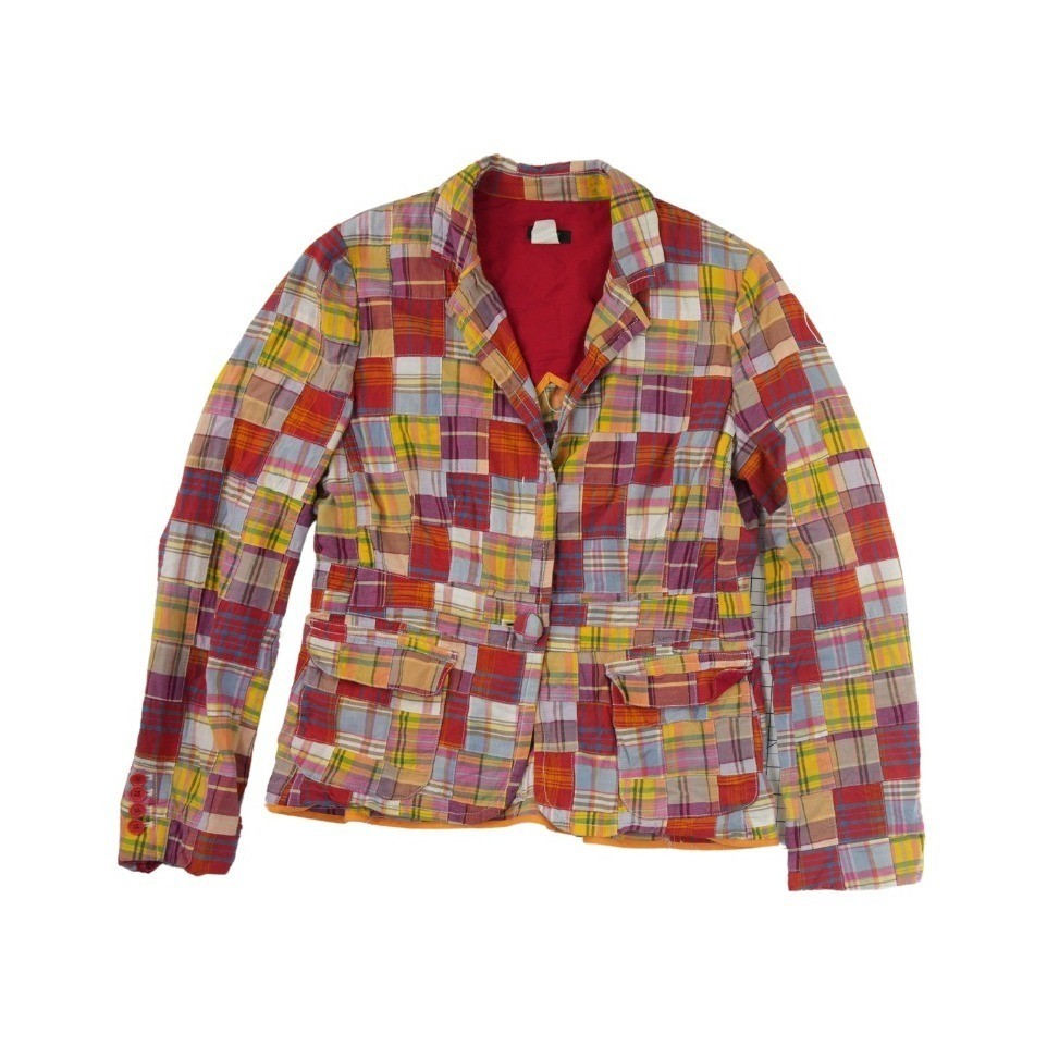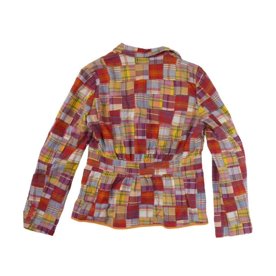 Excellent Condition! Vibrant patchwork plaid blazer offers a bold, eclectic aesthetic with its multi-color checked pattern and structured silhouette. Crafted from a comfortable cotton blend, this single-button jacket features a notched lapel, two front flap pockets, and a flattering cinched back detail that adds feminine shape. The interior is fully lined in a contrasting solid red, while the sleeve cuffs are finished with classic button detailing, making it a standout piece for transitioning through the seasons.