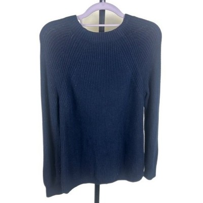 J Crew Mercantile navy blue ribbed sweater with a charming red plaid bow accent at the neckline. Raglan sleeves offer a comfortable fit, and the knit construction provides warmth and texture. Perfect for casual outings or a festive holiday gathering.
