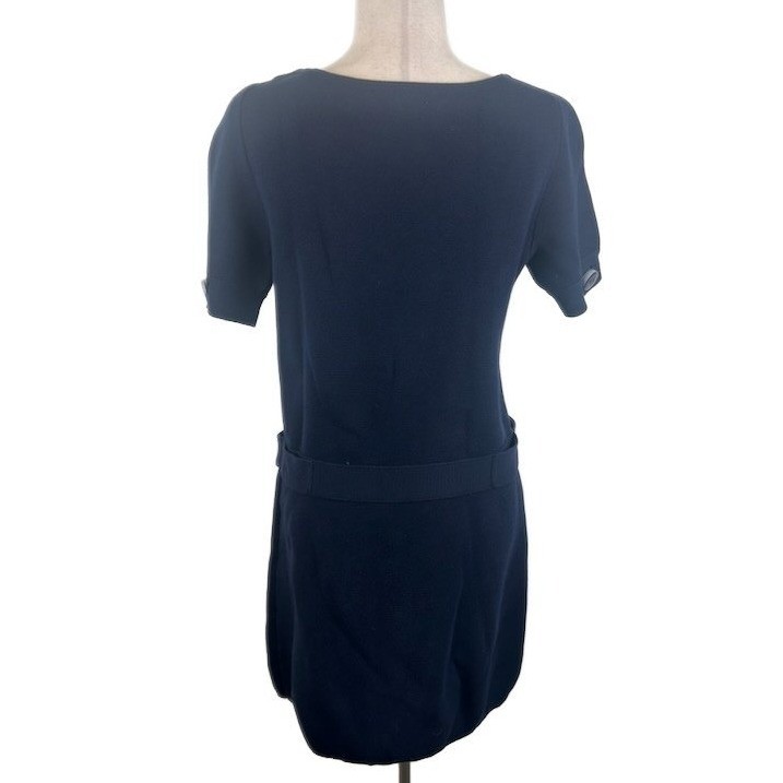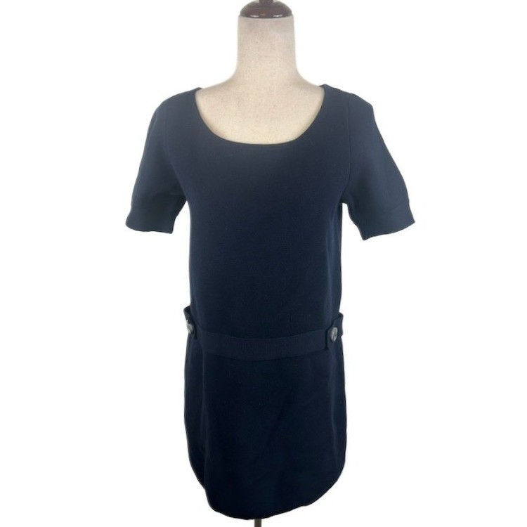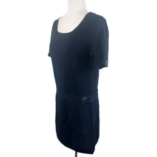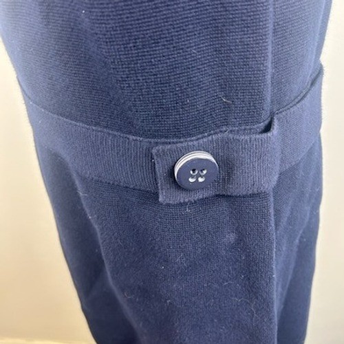Stylish knit dress by J. Crew, perfect for various occasions. This navy blue dress features a classic scoop neckline and short sleeves, offering a timeless and versatile look. The dress includes a fitted bodice with a banded waist detail accented by decorative buttons on either side, adding a touch of sophistication. Its comfortable knit construction provides a flattering silhouette, making it ideal for both casual and more dressed-up settings. Suitable for a business casual office environment, a weekend brunch, or a relaxed evening out.