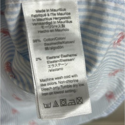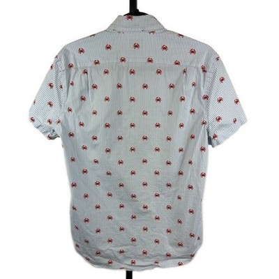 J. Crew Slim Fit Short Sleeve Button Down Shirt featuring a playful red crab pattern on a blue and white pinstripe fabric. This shirt offers a classic button-down collar, a single chest pocket, and a comfortable flex washed feel. Ideal for casual outings, beach vacations, or a relaxed weekend look.