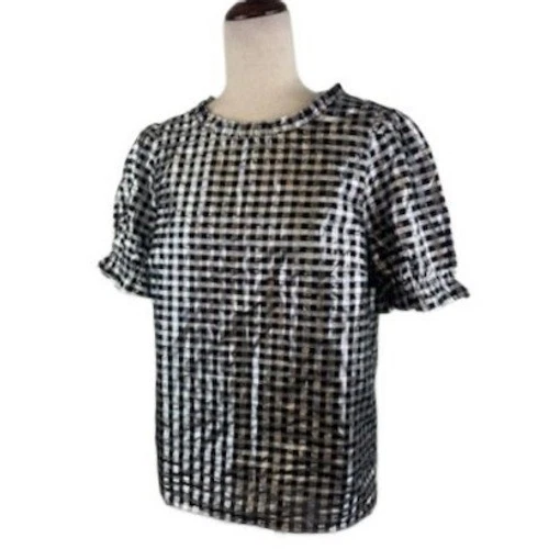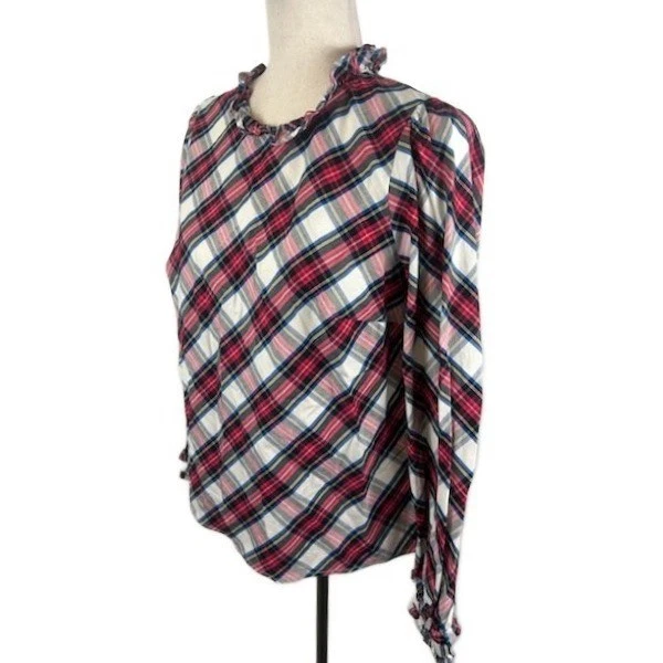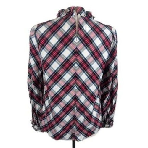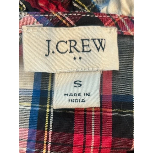 Excellent condition! Stylish plaid blouse from J. Crew offers a chic and sophisticated look. Featuring a charming ruffle neckline and cuffs, this long sleeve top adds a touch of femininity to any outfit. The classic plaid pattern, in shades of red, white, and blue, makes it a versatile piece for both casual and dressier occasions. Pair it with jeans or a skirt for a polished yet comfortable style, suitable for brunch with friends, a day at the office, or a casual evening out.