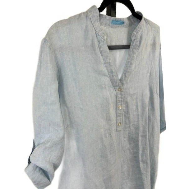 Excellent condition! J McLaughlin chambray tunic shirt dress in a light blue hue. This versatile piece features a V-neckline with a partial button placket and a stand collar. The sleeves can be rolled and secured with tab details for a casual look. Perfect for a beach vacation, weekend brunch, or a casual day out.