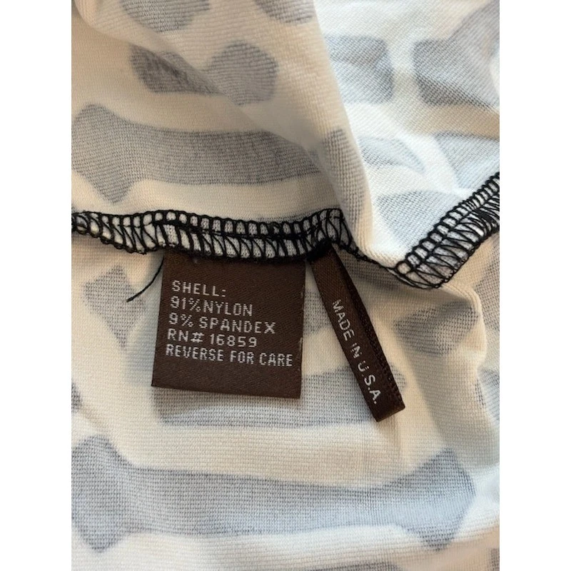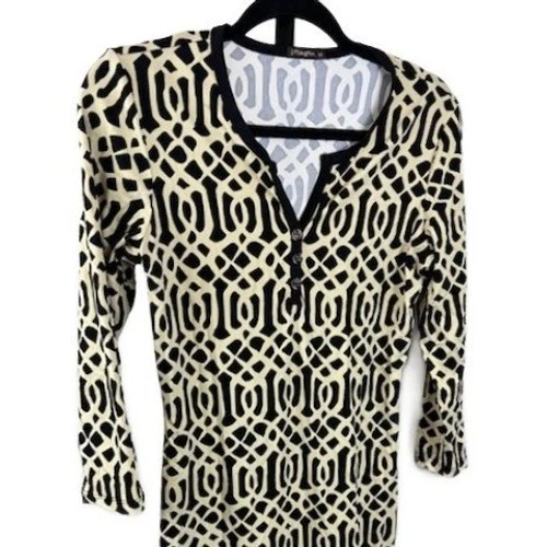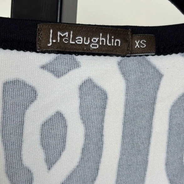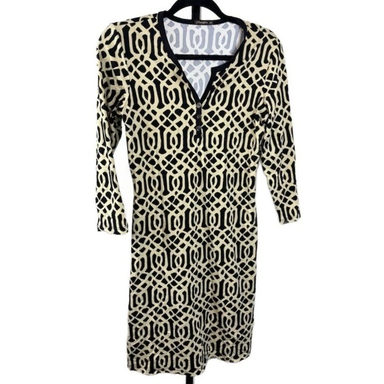 Excellent condition! This J.McLaughlin dress measures 36 inches in length. A black and cream geometric print quarter zip long sleeve dress. This knee-length dress offers a flattering silhouette with a V-neckline featuring a functional quarter zip and button detail. The repeating geometric pattern creates a visually striking aesthetic. Perfect for a casual day out or a smart-casual office environment.