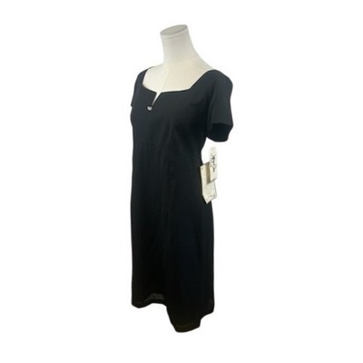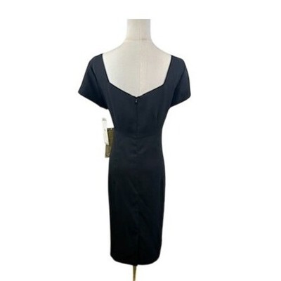 Commanding elegance arrives in this timeless black dress, perfect for making a sophisticated statement. A refined square neckline is accented by a subtle embellishment, adding a touch of understated glamour. The classic sheath silhouette flatters the figure, while the short sleeves offer comfortable coverage. This dress is ideal for evening events, professional settings, or any special occasion where you want to exude confidence and poise.