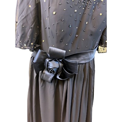 Elegance unfolds in this stunning navy gown, designed to make a lasting impression. Shimmering beads cascade across the bodice and neckline, catching the light with every movement. The flowing skirt drapes beautifully, creating a flattering silhouette, while the delicate chiffon sleeves offer graceful coverage. A satin ribbon cinches the waist, adorned with a charming rosette detail, adding a touch of romance. This gown is perfect for a formal wedding, an elegant evening gala, or any special occasion where you want to feel radiant and confident.