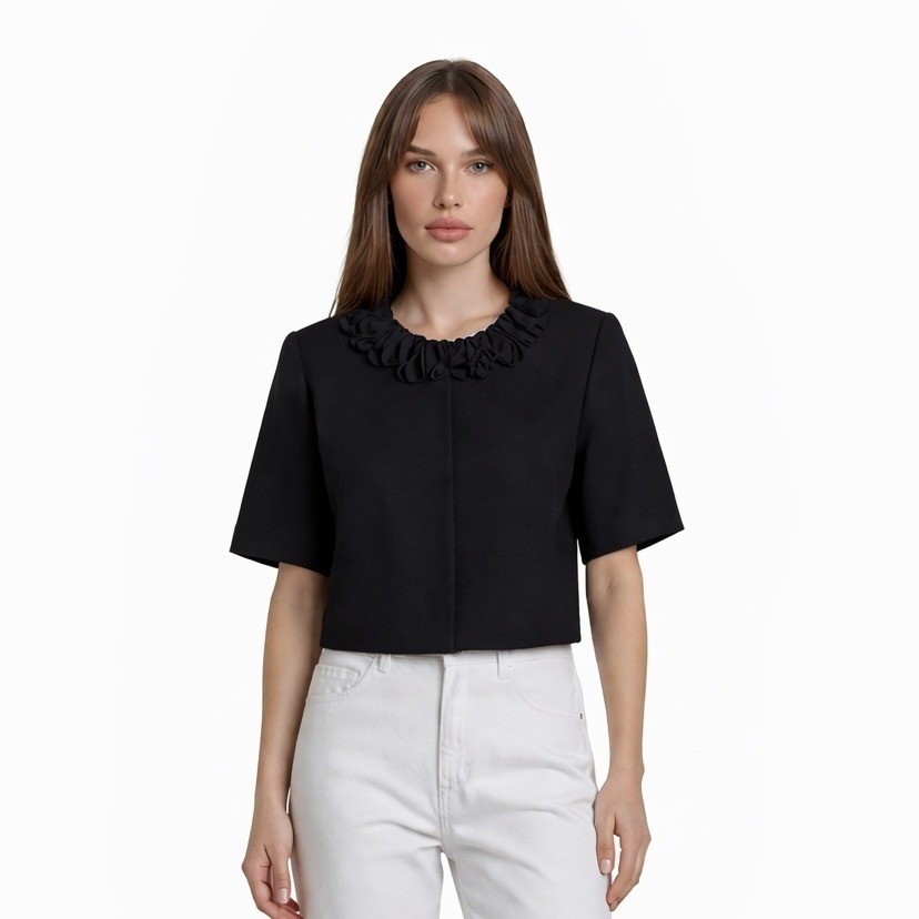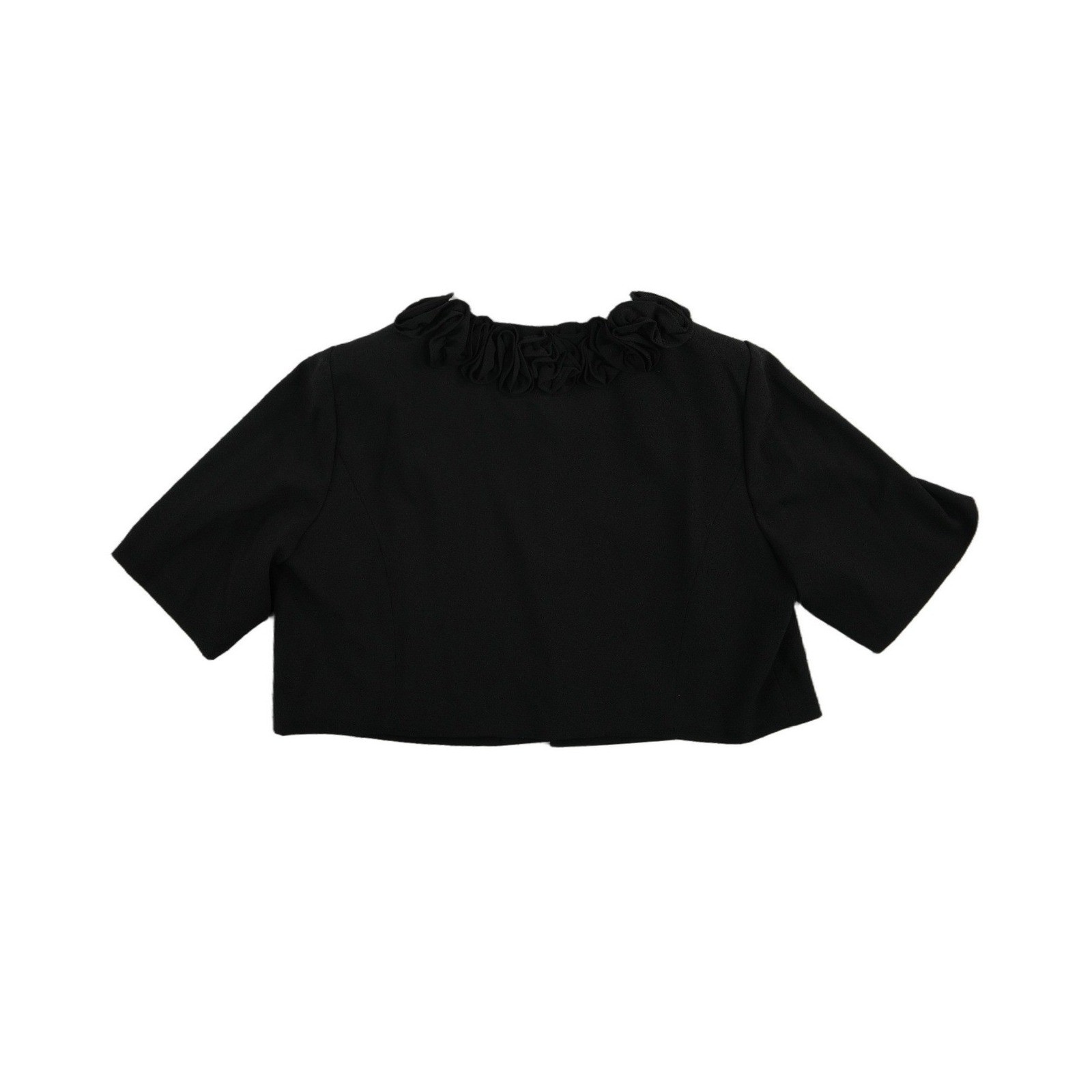 Keywords: Cocktail, Party, Evening Wear, Formal Layer, Rosette Detail, Ruffle Collar, Plus Size, Elegant, Sophisticated, Special Occasion, Bolero, Shrug, Cropped Jacket, Classic Black