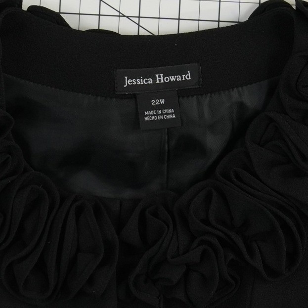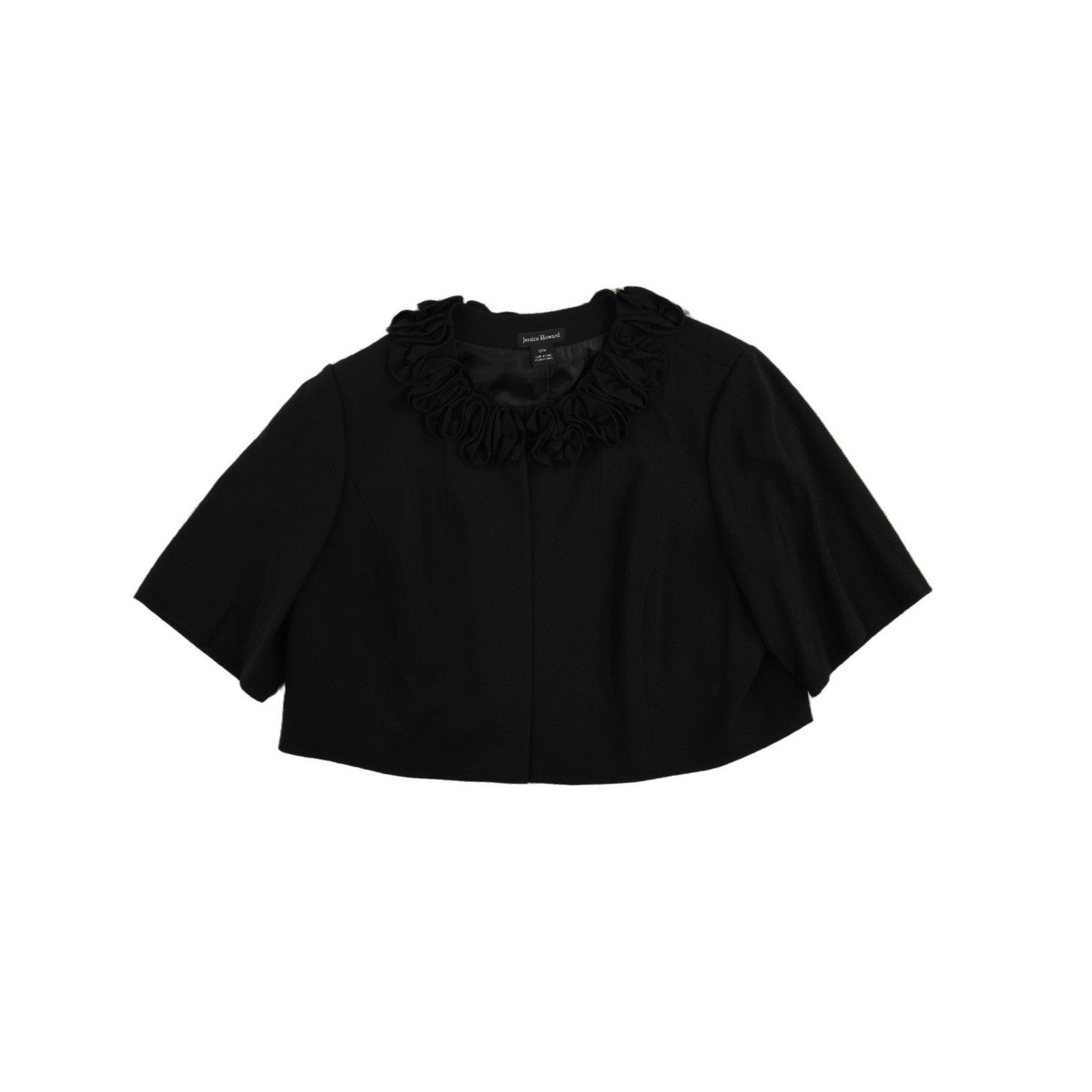 Excellent Condition! Jessica Howard cropped bolero jacket offers a sophisticated layer for formal occasions. This elegant shrug features a distinctive ruffled rosette collar that adds a romantic, textured touch to the neckline. Designed with a clean open front and short bell-style sleeves, it provides a flattering silhouette that pairs perfectly over evening gowns or cocktail dresses. The structured yet comfortable fabric blend includes a hint of stretch for ease of movement, while the full lining ensures a smooth fit.