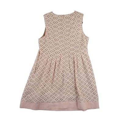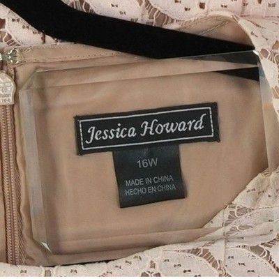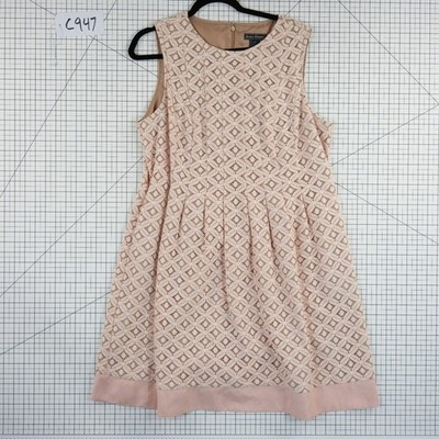 Excellent conditon! Jessica Howard sleeveless fit and flare dress in a delicate blush pink lace. This elegant piece features a geometric diamond eyelet overlay with a solid contrast hem and a classic round neckline. The structured silhouette is enhanced by subtle pleating at the waist, creating a flattering A-line shape. Fully lined for comfort and finished with a hidden back zipper closure, it is perfect for garden parties, weddings, or semi-formal daytime events.