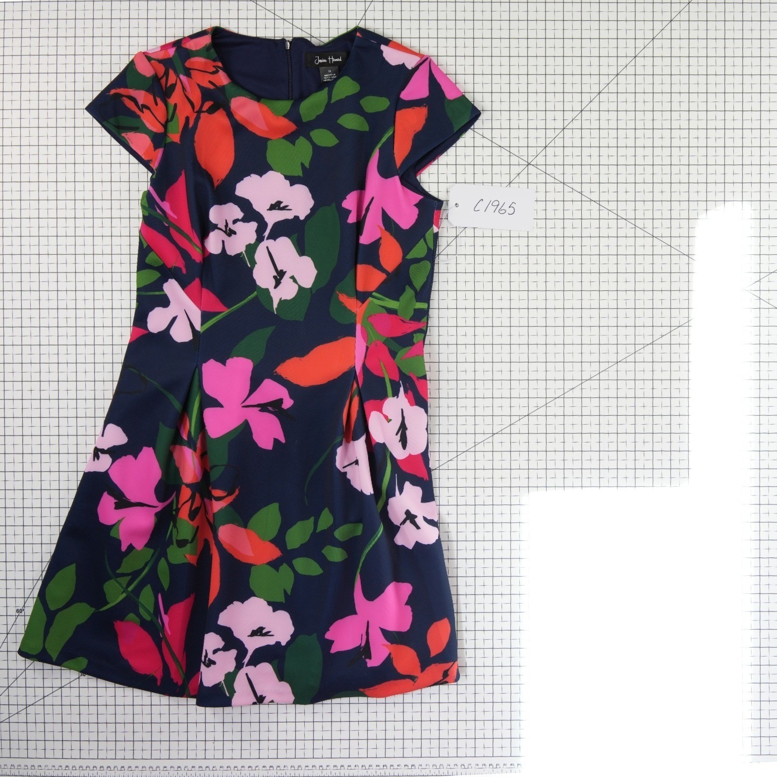 Excellent Condition! Vibrant floral print dress features a classic fit-and-flare silhouette with a sophisticated navy blue base and bold pink, orange, and green botanical patterns. The structured design includes a crew neckline, short cap sleeves, and subtle pleating at the waist for a flattering shape. A concealed back zipper ensures a seamless finish, while the stretch-blend fabric provides comfort for all-day wear.