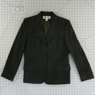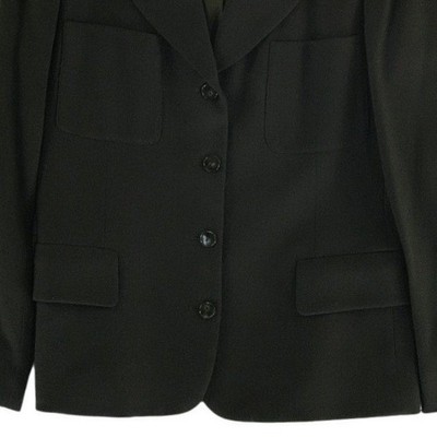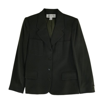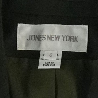 This Jones New York blazer measures approximately 23.5 inches in length, has a sleeve length of 19 inches, and is 13.5 inches pit-to-pit when laid flat. This sophisticated piece features a structured four-button front closure, notched lapels, and a unique four-pocket design with two chest slip pockets and two lower flap pockets. Fully lined for comfort, it showcases high-quality Made in USA construction with a tailored silhouette and subtle shoulder padding for a polished look.