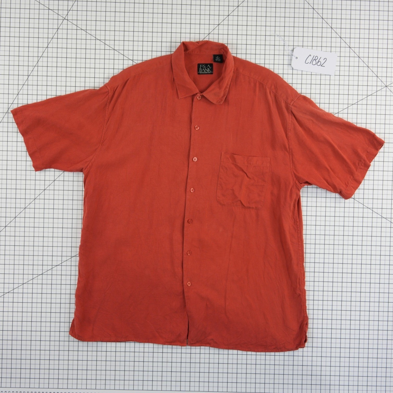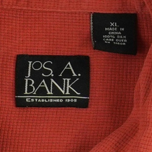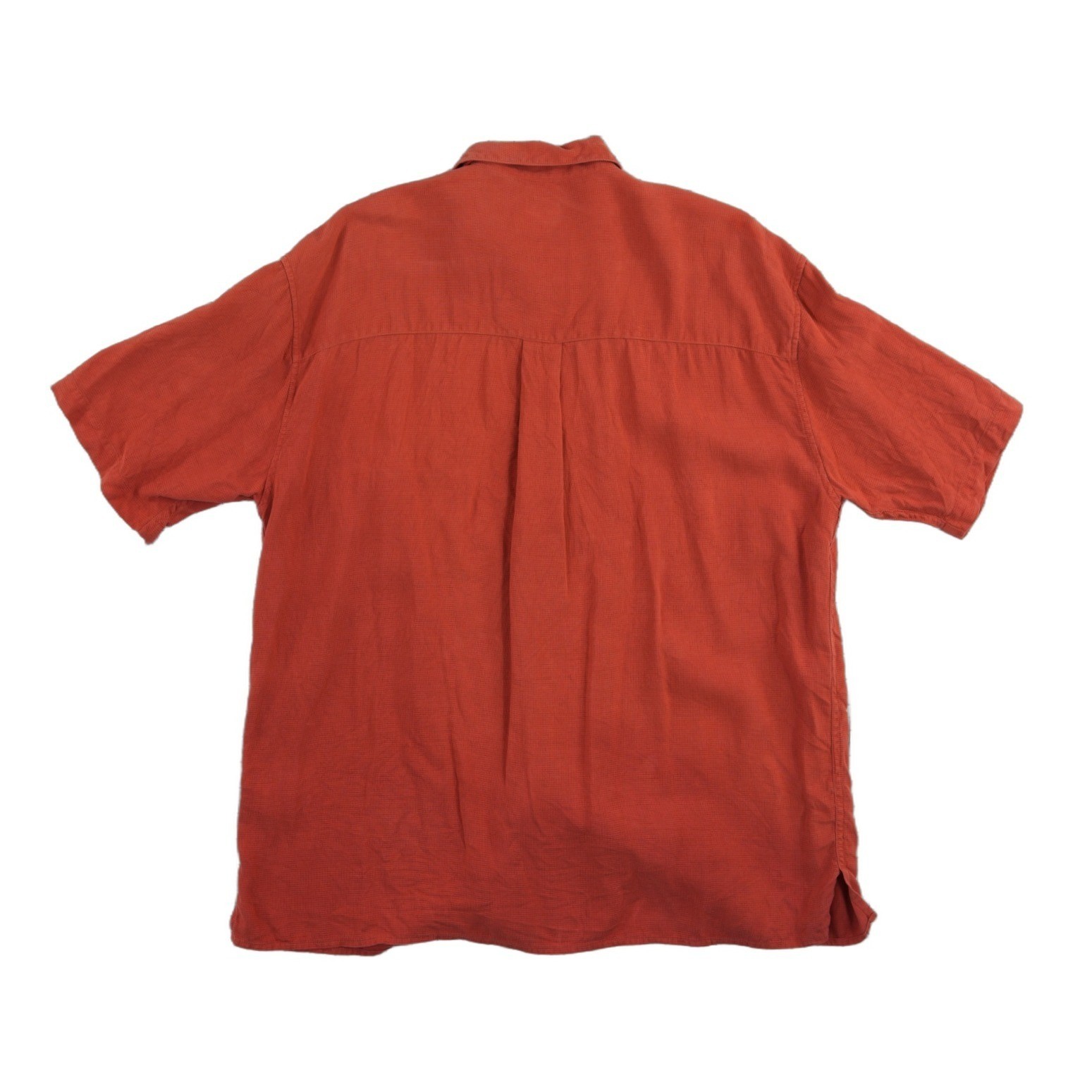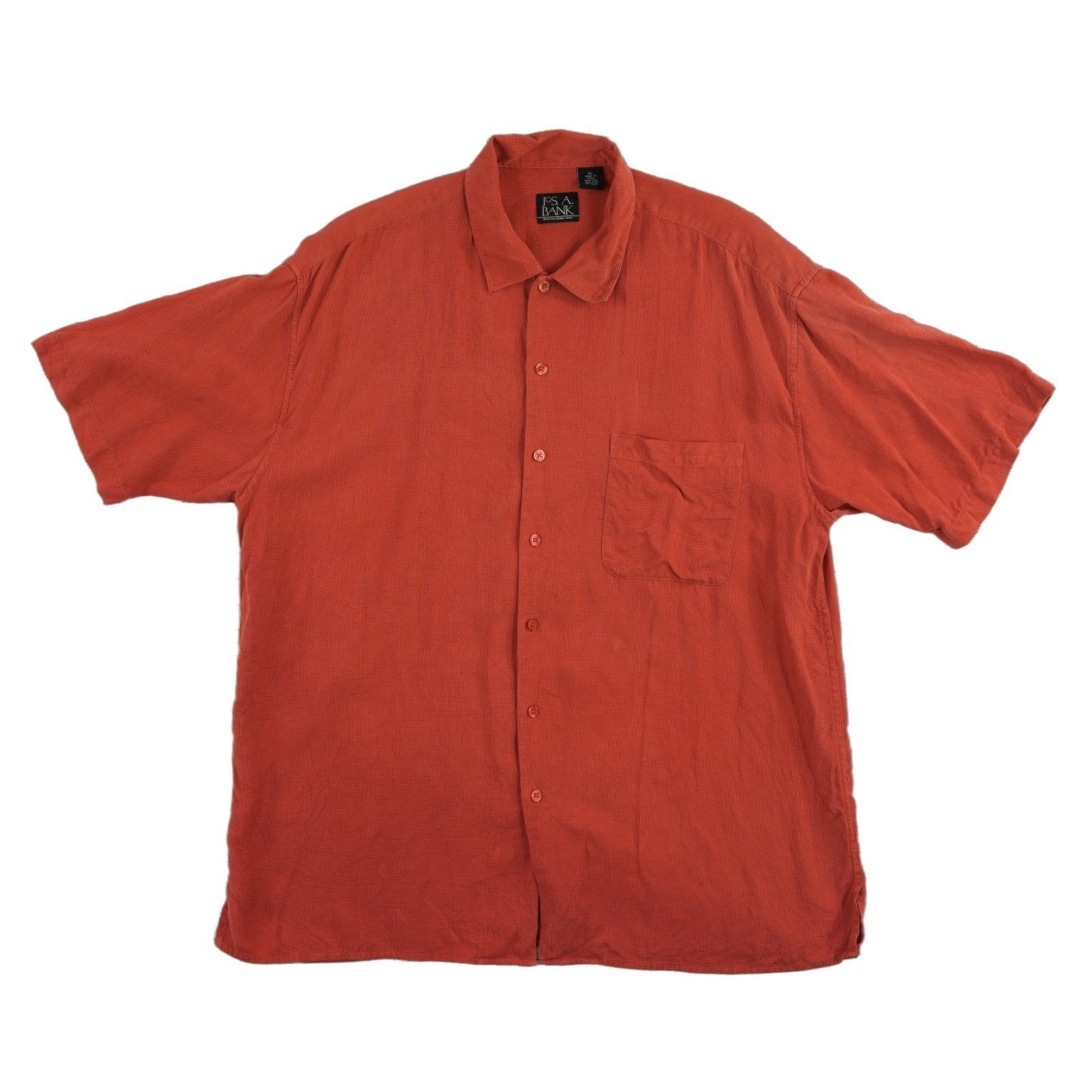 Excellent Condition! Jos. A. Bank short sleeve Hawaiian camp shirt in a vibrant burnt orange hue features a sophisticated waffle weave texture. Crafted from 100% silk, this lightweight piece offers a relaxed fit with a classic pointed collar, a single chest pocket, and a straight hem with side vents. The back includes a box pleat for added comfort and mobility, making it an ideal choice for warm-weather business casual or resort wear.