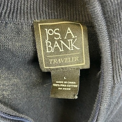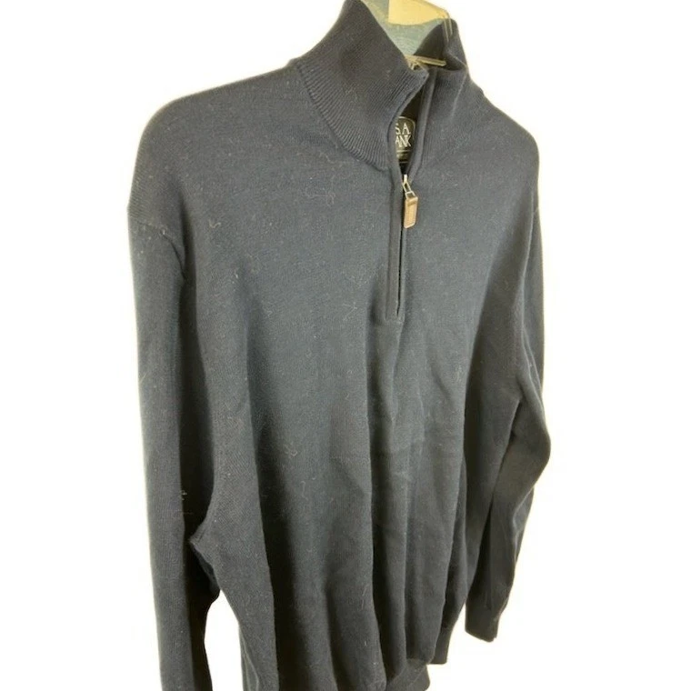 Jos A Bank Traveler quarter zip pullover sweater in navy blue. Ribbed collar, cuffs, and hem. A versatile layering piece perfect for casual outings or smart casual events.