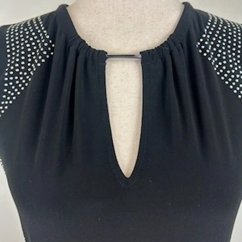 Chic and sophisticated sheath dress from Joseph Ribkoff. The timeless black color creates a sleek and flattering silhouette that will turn heads wherever you go. Studded detailing embellishes the shoulders and sides, adding a hint of edge and visual interest, while the keyhole neckline adds a touch of allure without revealing too much. Pair it with heels for a night out or dress it down with flats for a more casual event.