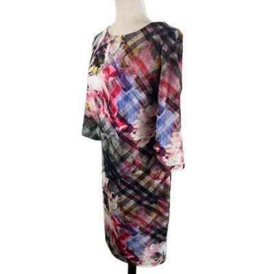 Sophisticated sheath dress showcasing a vibrant floral and plaid print. This elegant dress features a flattering silhouette and chic 3/4 sleeves. A versatile piece, perfect for both professional settings and special occasions. The knee length cut adds a touch of class, making it ideal for luncheons, garden parties, or a day at the office.
