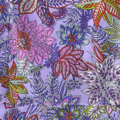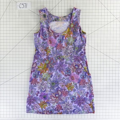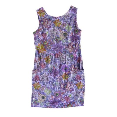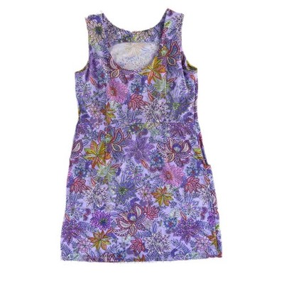 Vibrant sleeveless shift dress showcases a stunning multi-color floral and botanical print over a lavender purple base. Crafted from a comfortable, high-stretch nylon-spandex blend, this versatile piece features a classic round neckline, functional side pockets, and a playful cut-out detail at the upper back. The moisture-wicking fabric and easy pull-on style make it an ideal choice for travel, golf, or casual daytime outings.