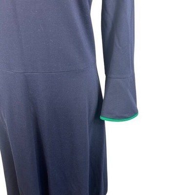 Keywords: Jude Connally, Navy Dress, Blue Dress, Green Trim, Fit and Flare, Long Sleeve Dress, Knit Dress, Women's Dress, Casual Dress, Business Casual, Midi Dress, Round Neck Dress