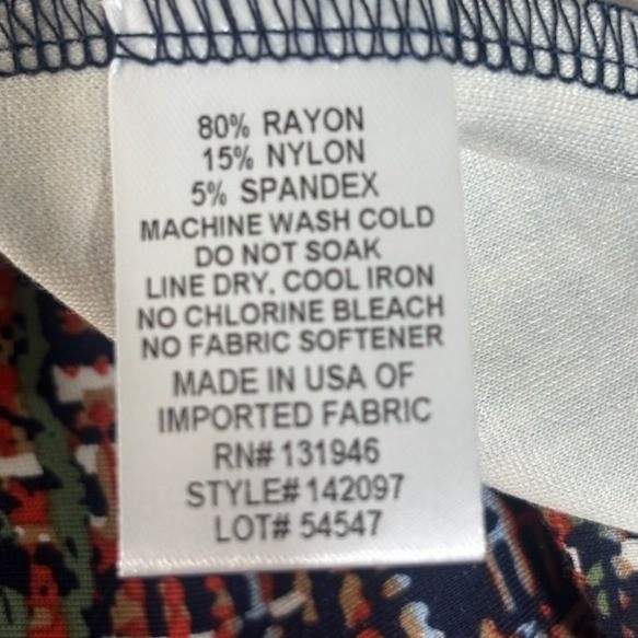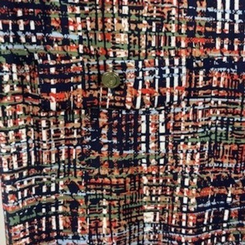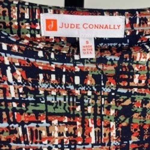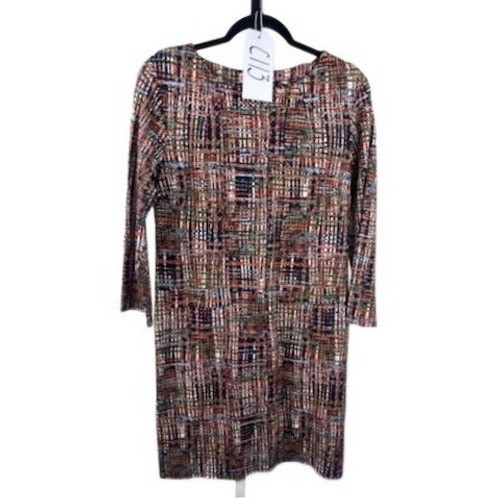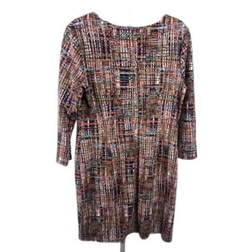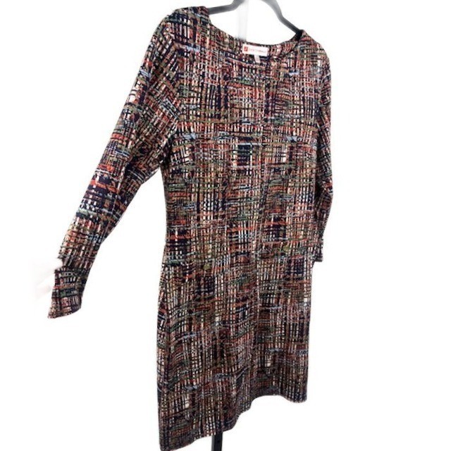 This Jude Connally women’s shift dress measures 36 inches in length, has a 3/4 sleeve length, and is 18 inches pit-to-pit laid flat. This dress features a classic round neckline and long sleeves, offering a comfortable and stylish silhouette. The intricate pattern combines navy, rust, olive green, and hints of light blue and cream for a unique look. A single button detail is present on the left chest pocket. Perfect for a casual day out or an office setting.