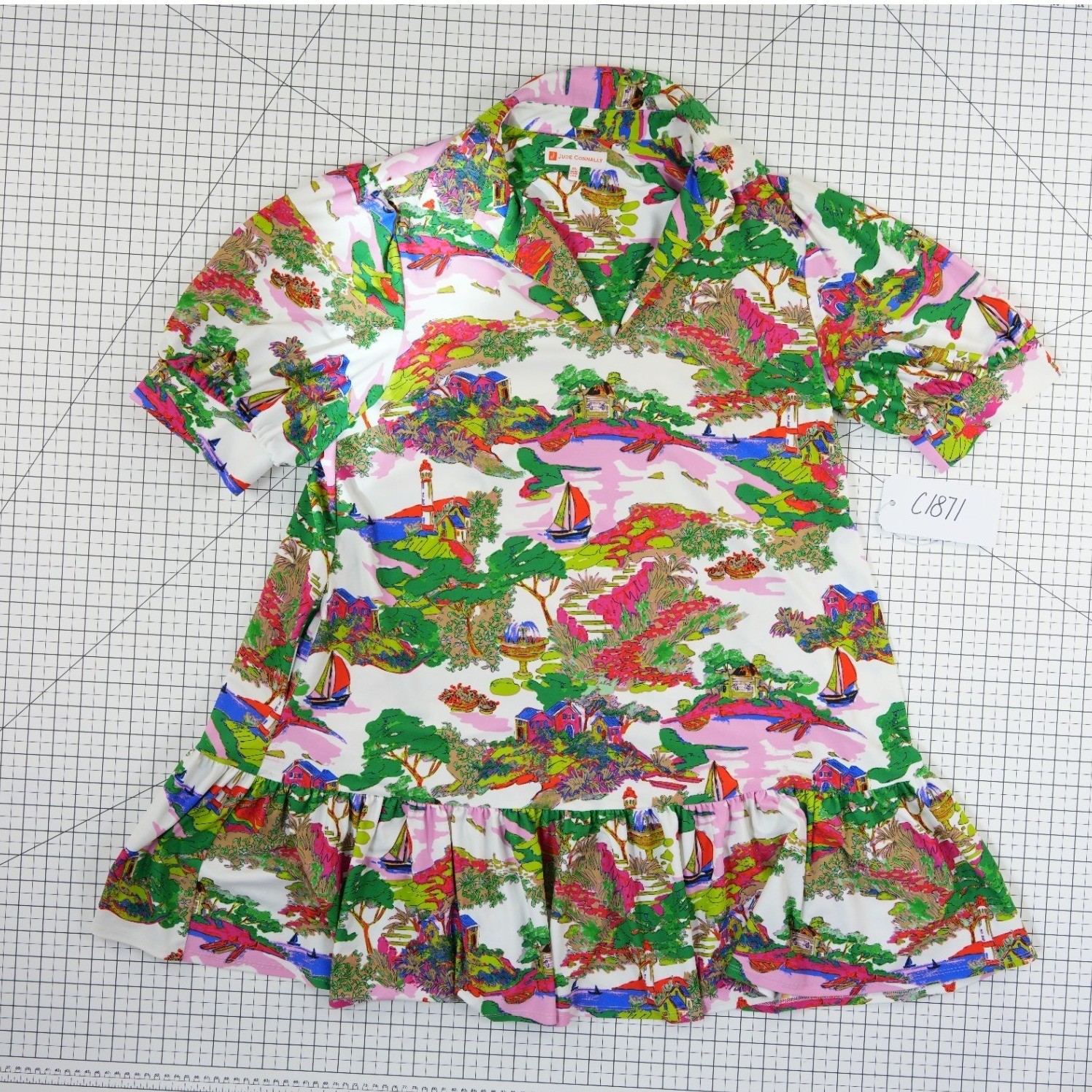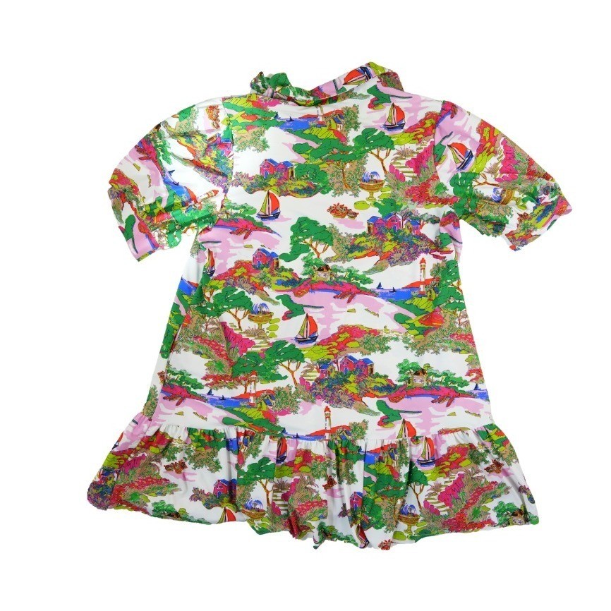 Excellent Condition! Vibrant landscape print dress features a whimsical nautical scene with sailboats, lighthouses, and lush scenery in a bright multi-color palette. The silhouette is designed with a classic collar, V-neckline, and short puff sleeves, finished with a playful ruffled hem. Crafted from a comfortable stretch nylon blend, this piece offers a relaxed fit that transitions easily from daytime outings to coastal vacations.