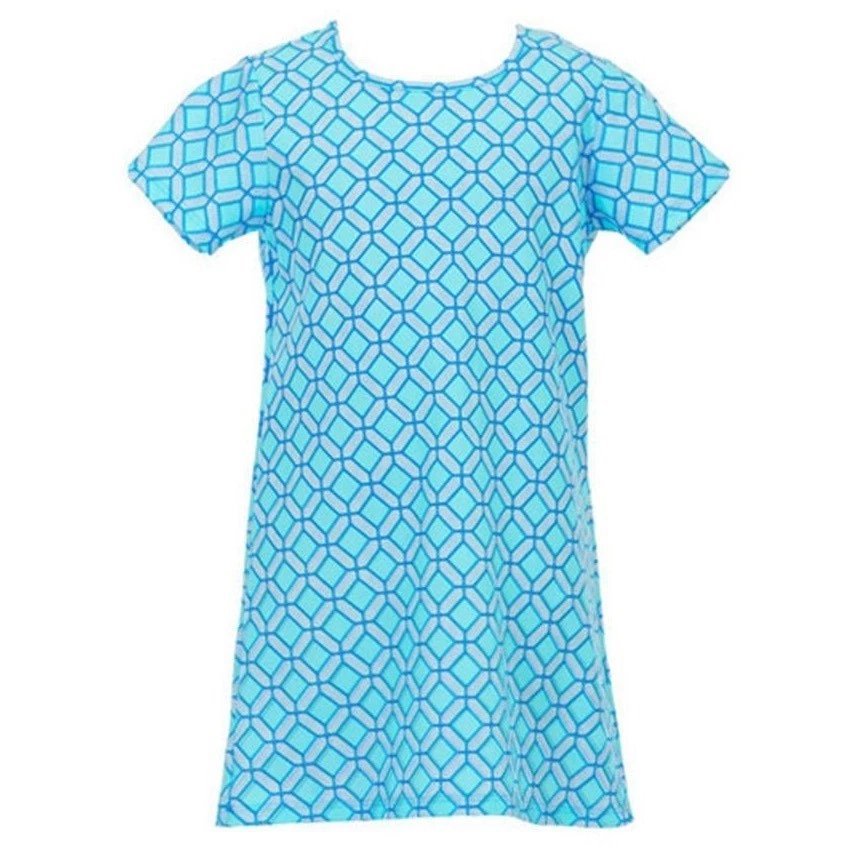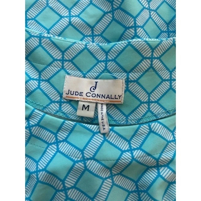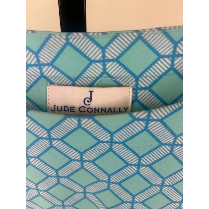 Chic and comfortable Jude Connally dress featuring an eye-catching aqua blue geometric print. This relaxed-fit, short-sleeve dress is perfect for warmer weather and offers easy, everyday style. The dress has a flattering silhouette and a soft, smooth feel against the skin. A versatile addition to any wardrobe, this dress is suitable for casual outings, weekend brunches, or even a relaxed day at the office.