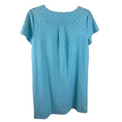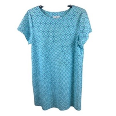 Chic and comfortable Jude Connally dress featuring an eye-catching aqua blue geometric print. This relaxed-fit, short-sleeve dress is perfect for warmer weather and offers easy, everyday style. The dress has a flattering silhouette and a soft, smooth feel against the skin. A versatile addition to any wardrobe, this dress is suitable for casual outings, weekend brunches, or even a relaxed day at the office.