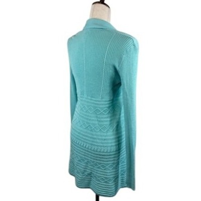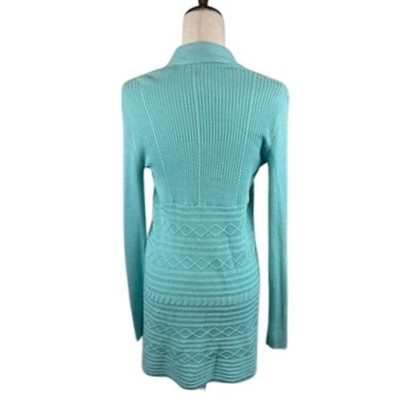 Stylish open front cardigan in a refreshing aqua hue. This rib knit design features a flattering draped silhouette, perfect for layering and adding a touch of effortless chic to any outfit. The unique knit pattern along the bottom back panel adds a subtle texture. Versatile and comfortable, it's ideal for casual outings, office wear, or a cozy evening at home.