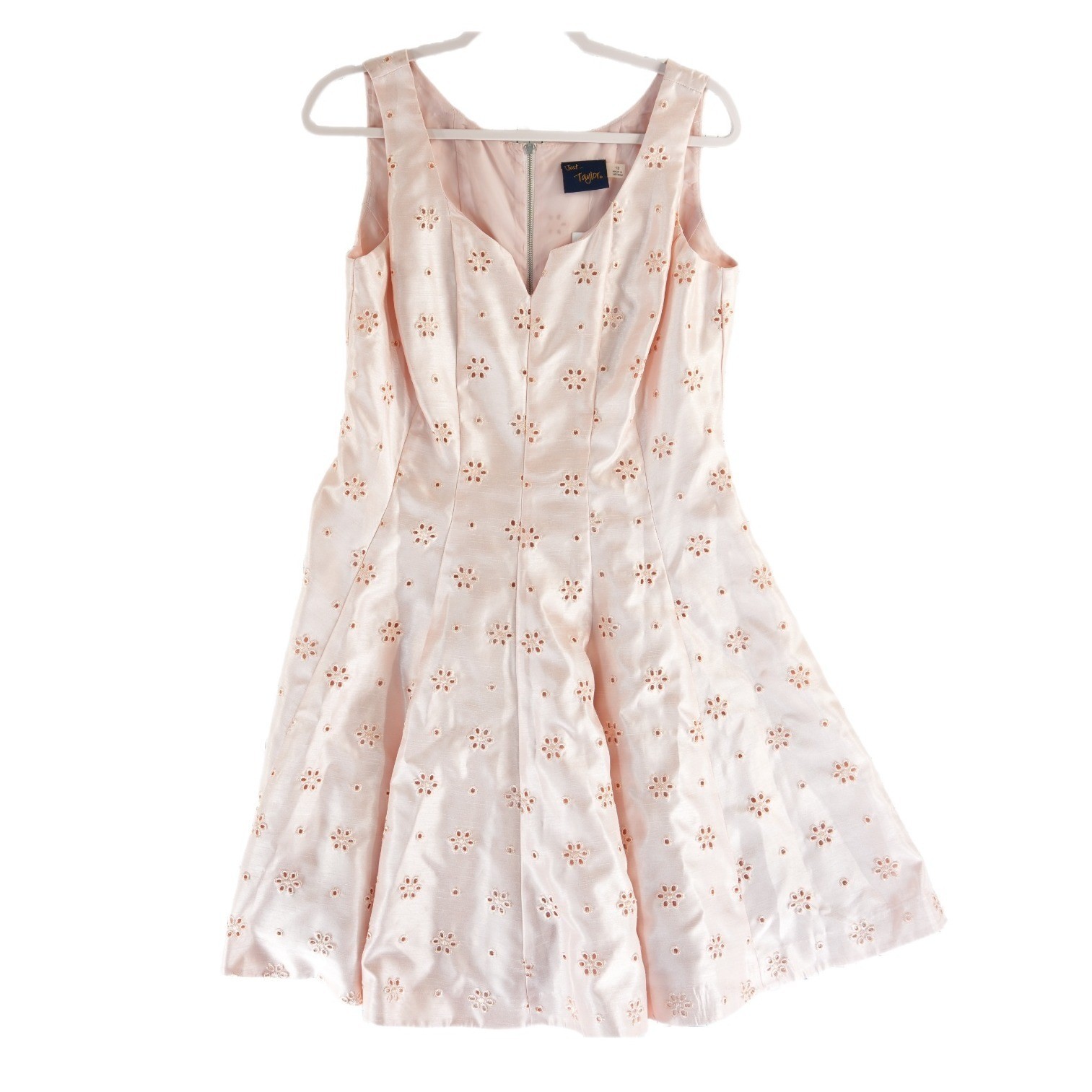Just Taylor peach eyelet fit and flare dress features a delicate floral eyelet pattern throughout the shimmering fabric. Designed with a notched V-neckline and a sleeveless silhouette, this piece includes a structured bodice with princess seams that transition into a pleated, voluminous skirt. A functional exposed silver-tone zipper at the back adds a modern touch to the classic feminine design, while the full lining ensures a smooth fit.