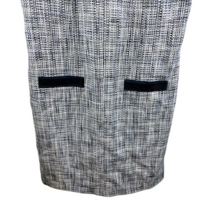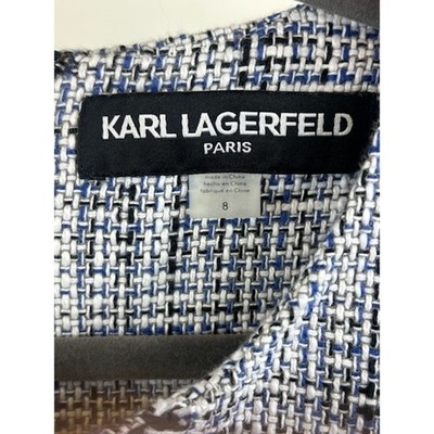 Keywords: Karl Lagerfeld dress, tweed dress, sleeveless dress, mini dress, blue dress, white dress, size 8 dress, business casual, career dress, work dress, dress with pockets, preppy dress, chic dress, designer dress