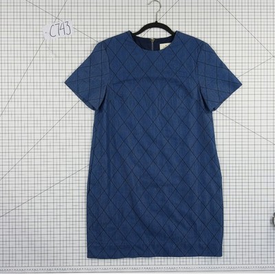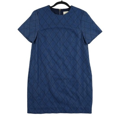 Excellent condition! Classic shift dress crafted from a structured denim-like cotton and lyocell blend. This piece features a distinctive quilted diamond pattern throughout, adding texture and visual interest to the deep blue indigo wash. Designed with a clean round neckline, short sleeves, and a full-length exposed gold-tone back zipper for a modern touch. The interior is fully lined in soft cotton, maintaining the high-quality construction expected from the brand.