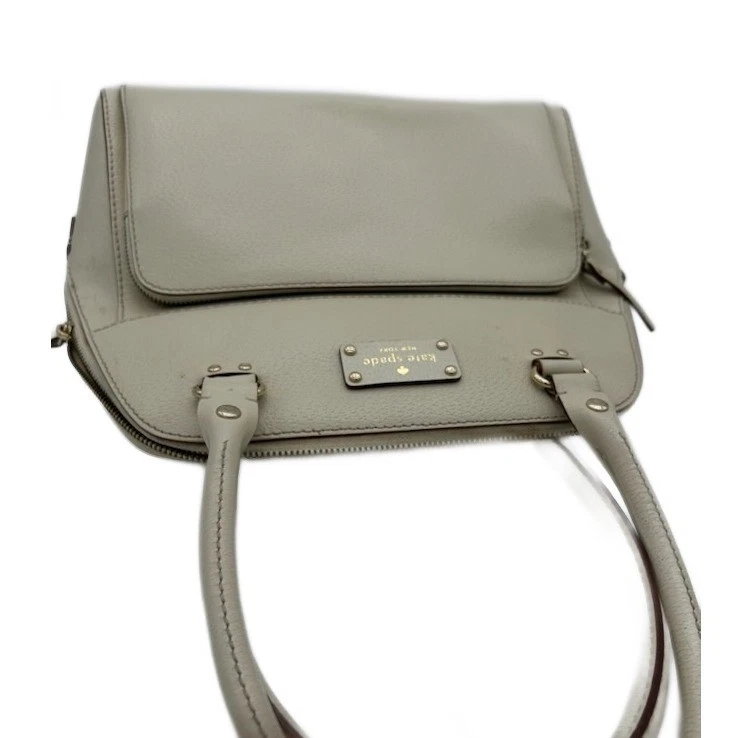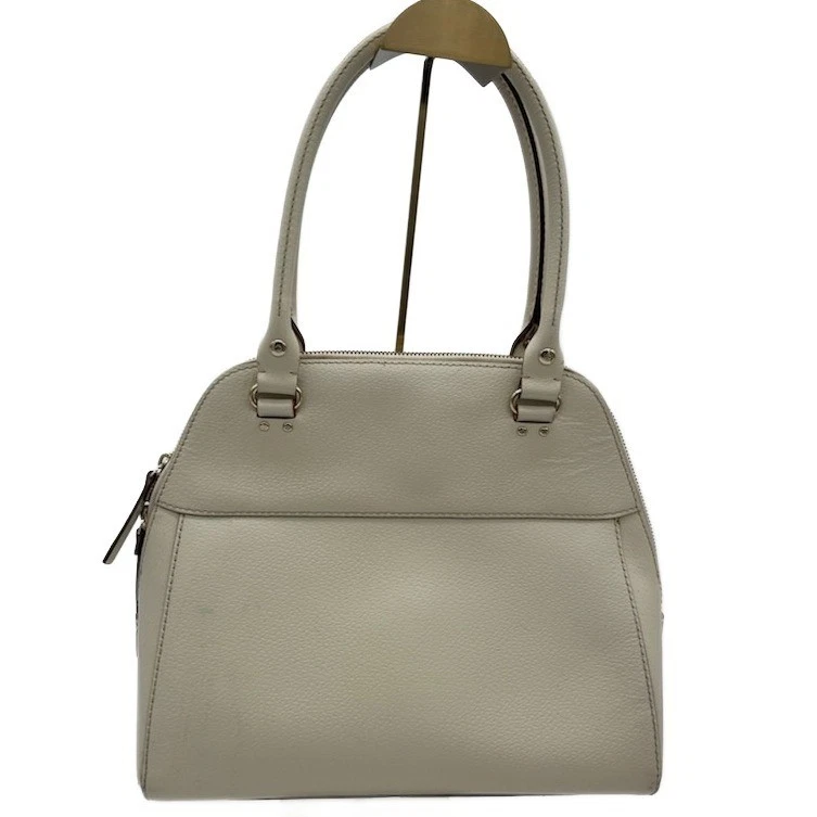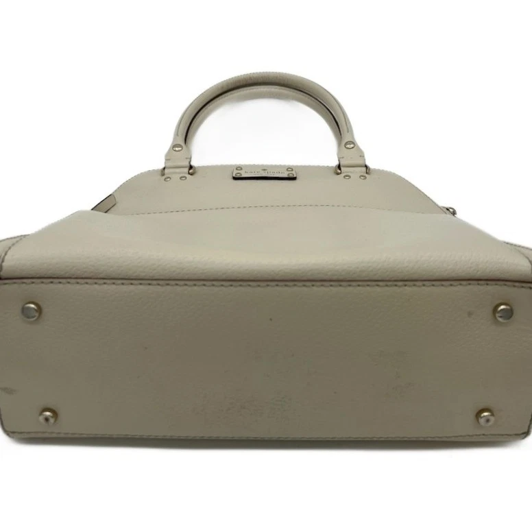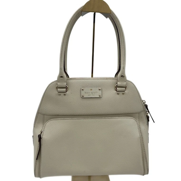 Ivory satchel handbag by Kate Spade New York: a stylish and functional accessory for the modern woman. This elegant bag features a classic satchel design with smooth top handles and a secure zip-top closure, offering both sophistication and practicality. The exterior includes a convenient front slip pocket, perfect for easy access to essential items, while the interior boasts a playful polka dot lining and multiple compartments to keep belongings organized. Versatile enough for both professional settings and casual outings, this Kate Spade satchel is an ideal choice for business meetings, weekend brunches, and travel.