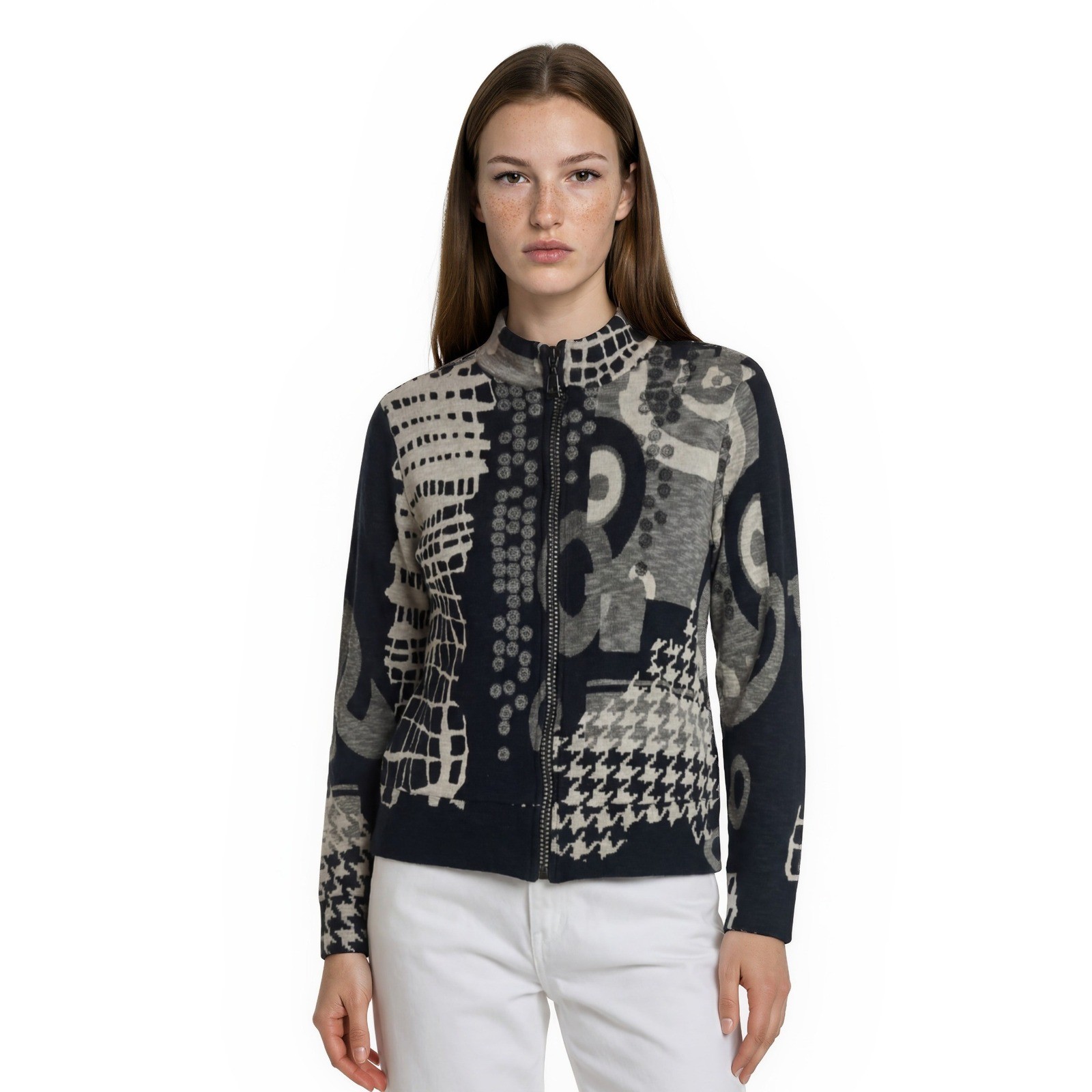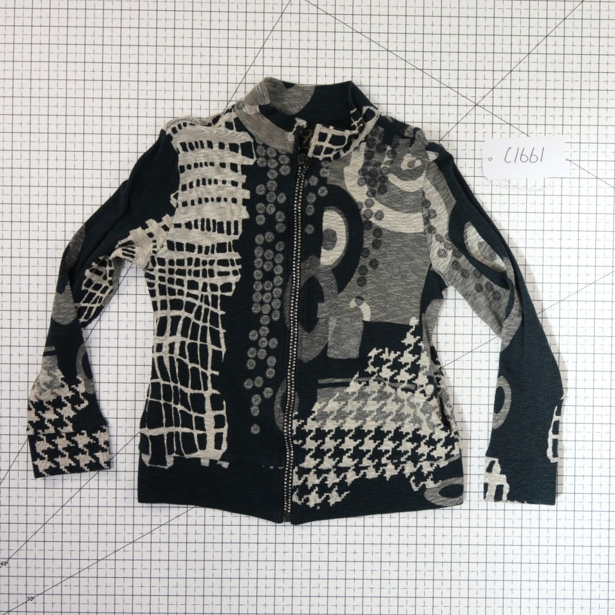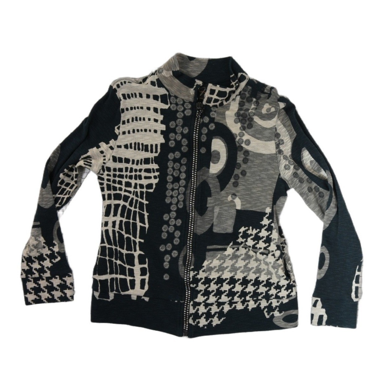 Excellent Condition! Katina Marie full-zip jacket showcases a bold mixed-media aesthetic with an eclectic blend of abstract prints including houndstooth, grid patterns, and geometric swirls. This lightweight cotton layer features a high mock neck and a slim, tailored fit, perfect for adding a touch of artistic flair to a casual ensemble. The monochromatic black and grey palette ensures versatility while the varied textures and patterns create a striking visual impact. Crafted in the USA, this unique piece combines comfort with a sophisticated, avant-garde design.