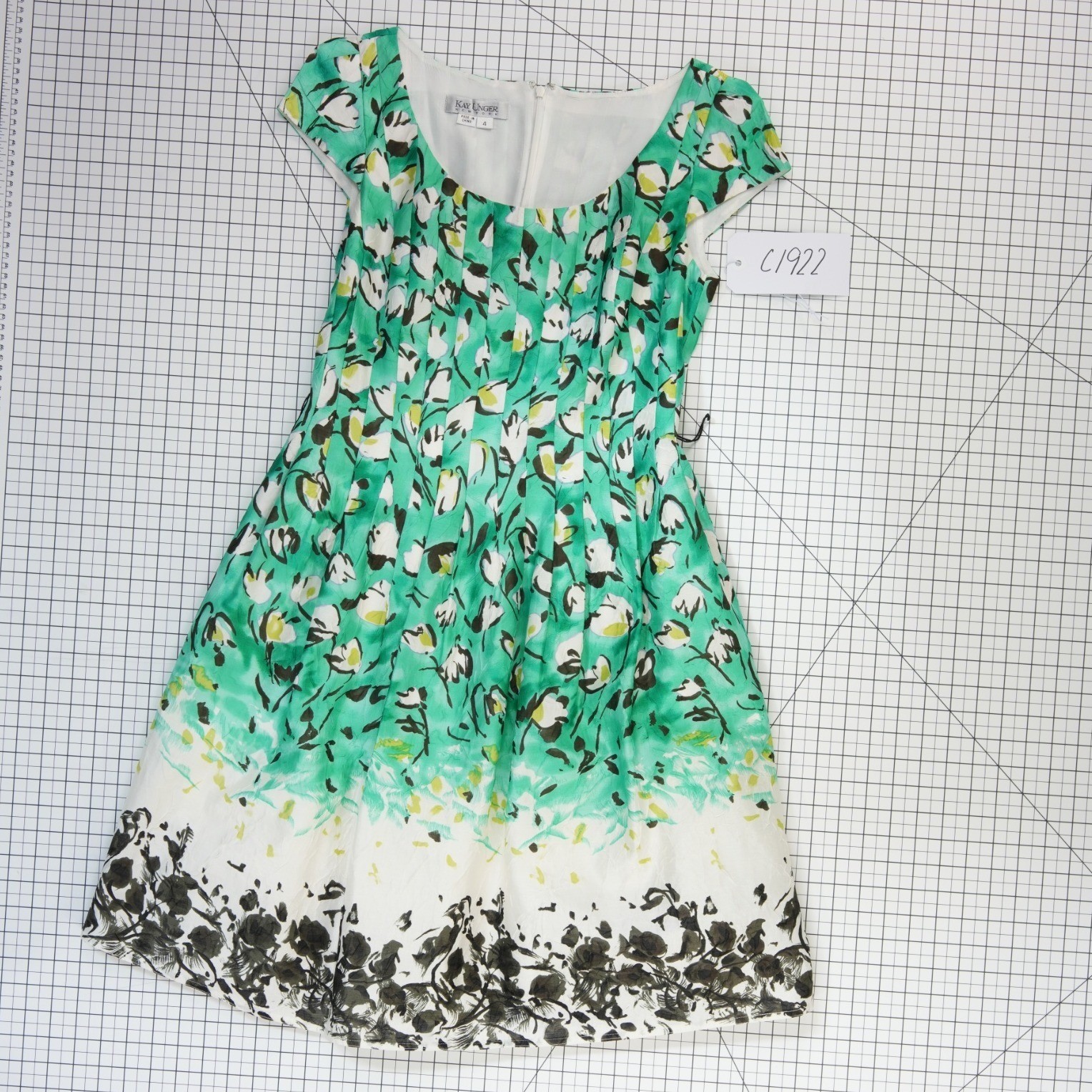 Excellent Condition! Kay Unger New York fit and flare dress showcases a vibrant green and white floral watercolor print with a sophisticated pleated texture. This elegant piece features a flattering scoop neckline, cap sleeves, and a structured bodice that flows into a full skirt, complete with a contrasting dark floral border at the hem. Crafted from a luxurious cotton and silk blend, the fabric offers a subtle sheen and crisp hand-feel, while the full lining ensures a smooth, comfortable fit. A concealed back zipper provides a seamless finish to this garden-party-ready silhouette.