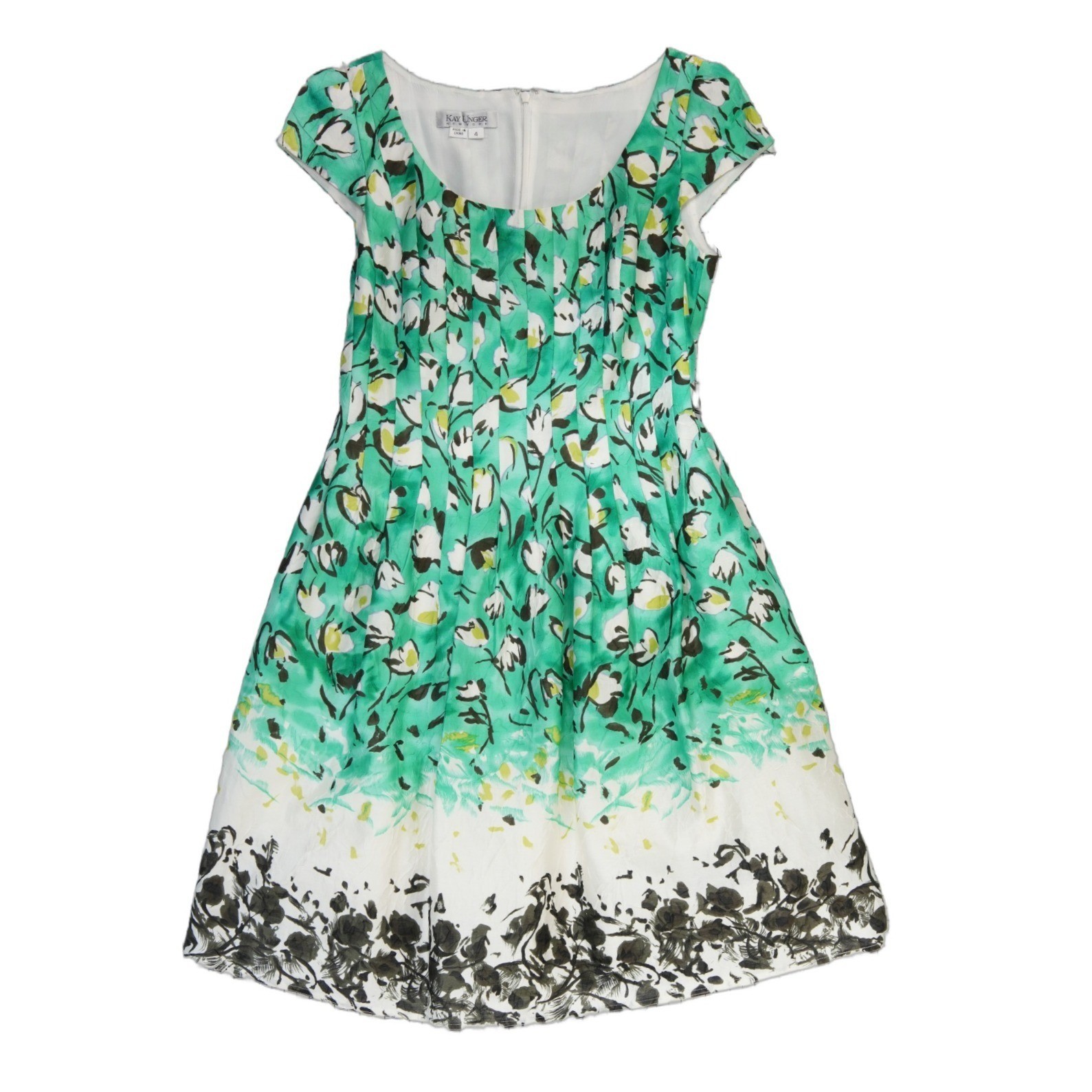Excellent Condition! Kay Unger New York fit and flare dress showcases a vibrant green and white floral watercolor print with a sophisticated pleated texture. This elegant piece features a flattering scoop neckline, cap sleeves, and a structured bodice that flows into a full skirt, complete with a contrasting dark floral border at the hem. Crafted from a luxurious cotton and silk blend, the fabric offers a subtle sheen and crisp hand-feel, while the full lining ensures a smooth, comfortable fit. A concealed back zipper provides a seamless finish to this garden-party-ready silhouette.