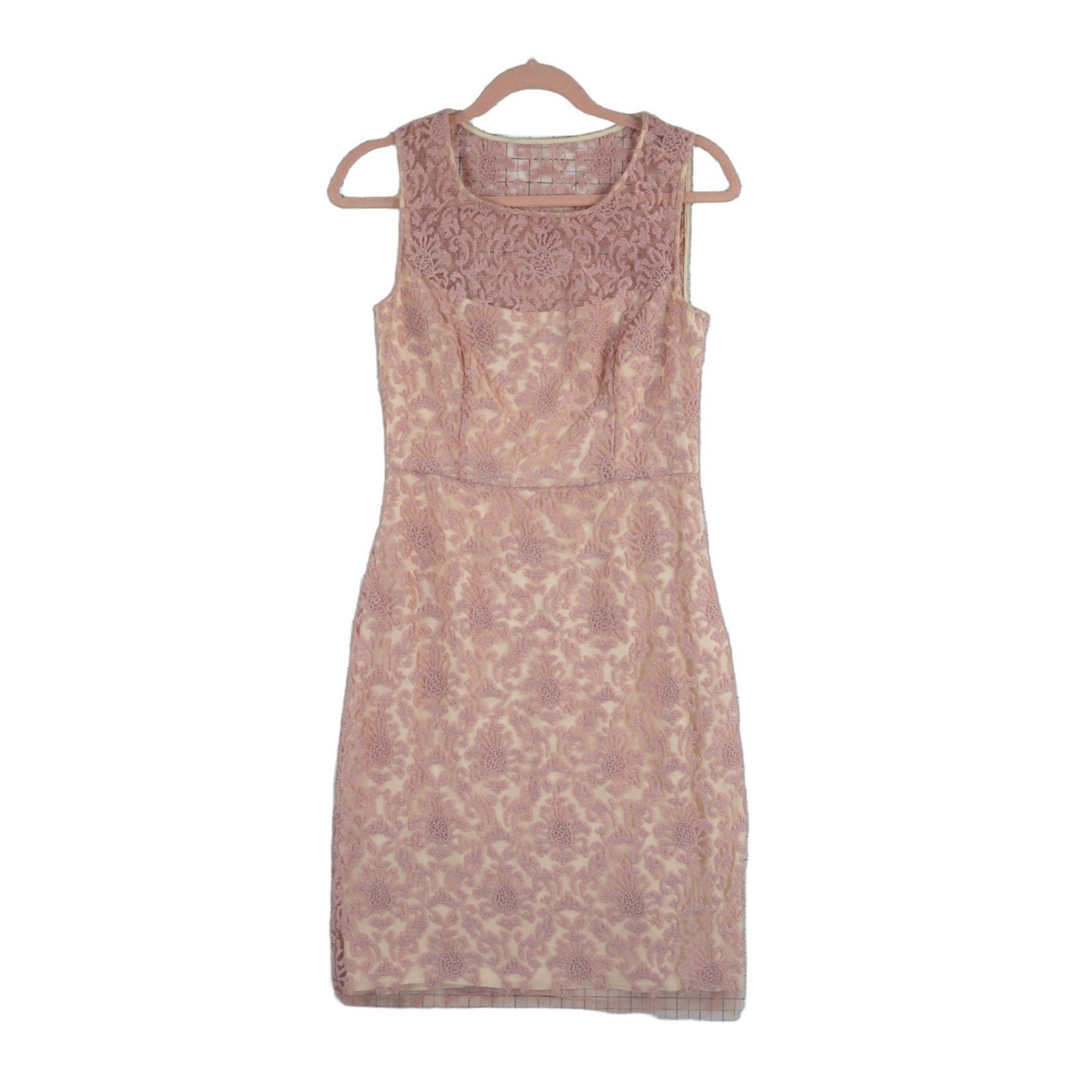 Excellent Condition! Intricate floral lace overlay defines this elegant sheath dress, featuring a delicate scalloped hem and a sheer lace yoke for a touch of sophistication. Designed with a sleeveless silhouette and a classic round neckline, the dress is fully lined in a contrasting cream tone that beautifully highlights the dusty rose lace pattern. A subtle stretch in the lining ensures a comfortable, form-fitting shape perfect for cocktail parties, weddings, or formal luncheons.