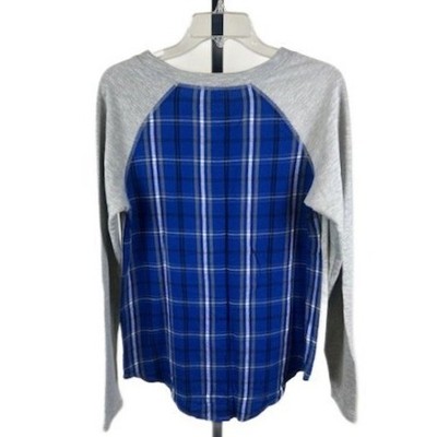 Like new! Stylish crewneck shirt featuring the Kentucky Wildcats logo. This comfortable and eye-catching top showcases a gray body with raglan sleeves, complemented by a unique blue plaid flannel back. The front displays the 'Kentucky Wildcats' logo with 'Est. 1865' in classic blue and white lettering. A perfect blend of sporty and casual, this sweatshirt offers both comfort and style. Ideal for game days, casual outings, or cozy nights in, this Kentucky Wildcats sweatshirt lets you show your team spirit in a fashionable way.