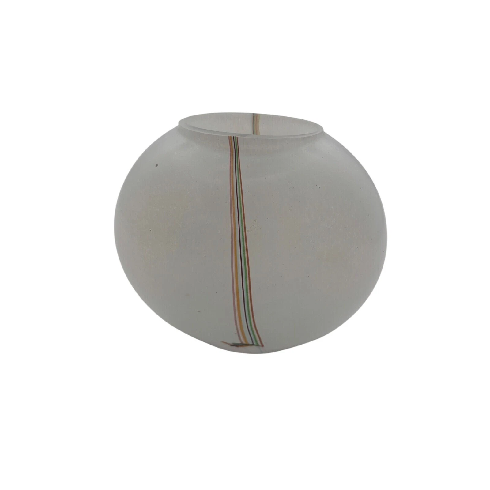 Orb of elegance, this Kosta Boda Bertil Vallien art glass vase captivates with its spherical form and subtle, frosted finish. A delicate dance of multicolor stripes gracefully encircles the vase, adding a touch of whimsy and sophistication. The smooth, rounded shape invites touch, while the soft, diffused light filtering through the glass creates a serene ambiance. This piece is a testament to refined artistry, perfect for showcasing a single bloom, adding a pop of color to a minimalist space, or gracing a bookshelf with its understated charm.