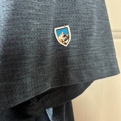 Excellent condition! This Kuhl men's short sleeve polo shirt in a blue heathered knit measures 29 inches in length and 23 inches pit to pit laid flat. This versatile top features a classic button placket with three buttons and subtle horizontal seam details across the chest. A small embroidered mountain logo adorns the left sleeve, hinting at its outdoor-ready design. Perfect for casual outings, hiking adventures, or travel.