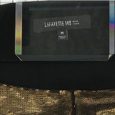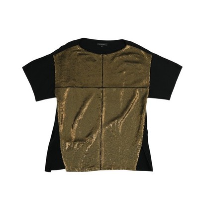 Excellent Condition! Lafayette 148 New York short sleeve top features a striking gold sequined front panel set against a solid black back and sleeves. This mixed-media blouse combines a luxurious 100% silk combo with a textured sequin finish, offering a sophisticated boxy silhouette with a classic crew neckline and side slits for ease of movement. Perfect for evening events or adding a touch of glamour to a professional ensemble.