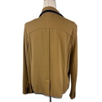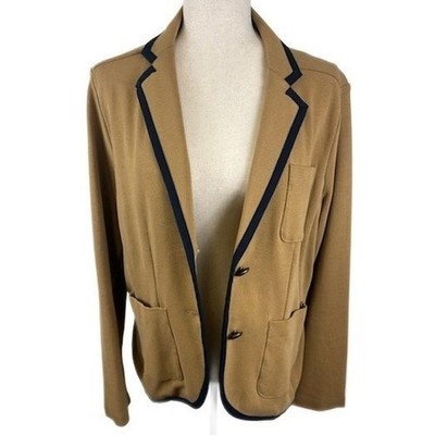 A sophisticated and versatile Lands' End blazer jacket, ideal for elevating your professional or casual wardrobe. This single-breasted blazer features a classic tan/brown color with contrasting black trim that outlines the lapel and pockets, adding a touch of elegance. Boasting a two-button closure, long sleeves, and functional front pockets, it combines style and practicality. The structured silhouette offers a flattering fit, making it suitable for business meetings, weekend outings, or smart-casual events.