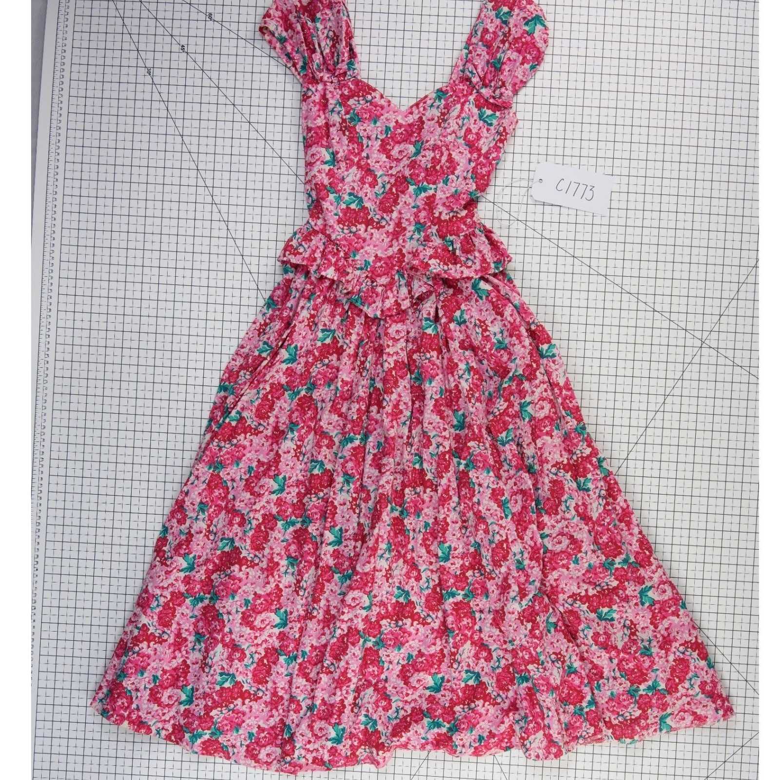 Excellent Condition! Vintage Laura Ashley midi dress showcases a vibrant pink floral print on a crisp cotton fabric, embodying classic British romanticism. The silhouette features a sweetheart neckline with delicate cap sleeves and a distinctive peplum waist detail that flows into a full, pleated skirt. A concealed back zipper ensures a streamlined fit, while the Made in Great Britain craftsmanship highlights the quality of this archival piece. Perfect for garden parties, weddings, or achieving a timeless cottagecore look.