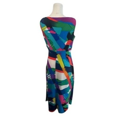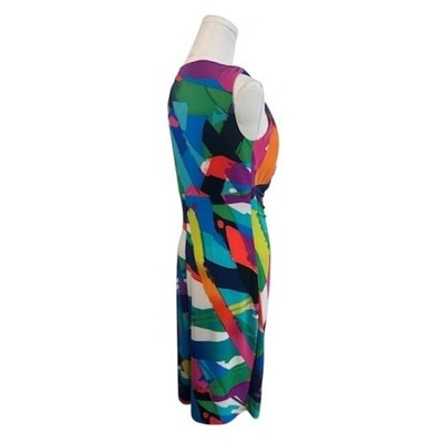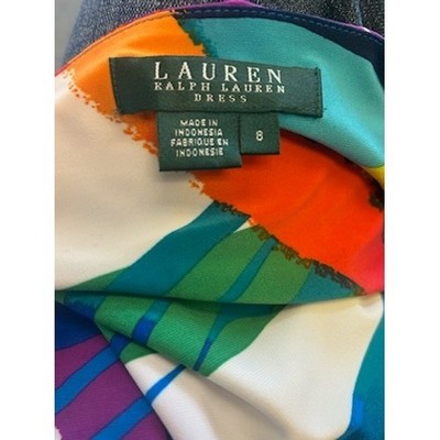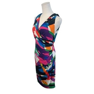 Keywords: Lauren Ralph Lauren dress, abstract print dress, sleeveless sheath dress, v-neck dress, ruched dress, size 8 dress, colorful dress, party dress, cocktail dress, women's fashion, designer dress, modern dress, summer dress, casual dress